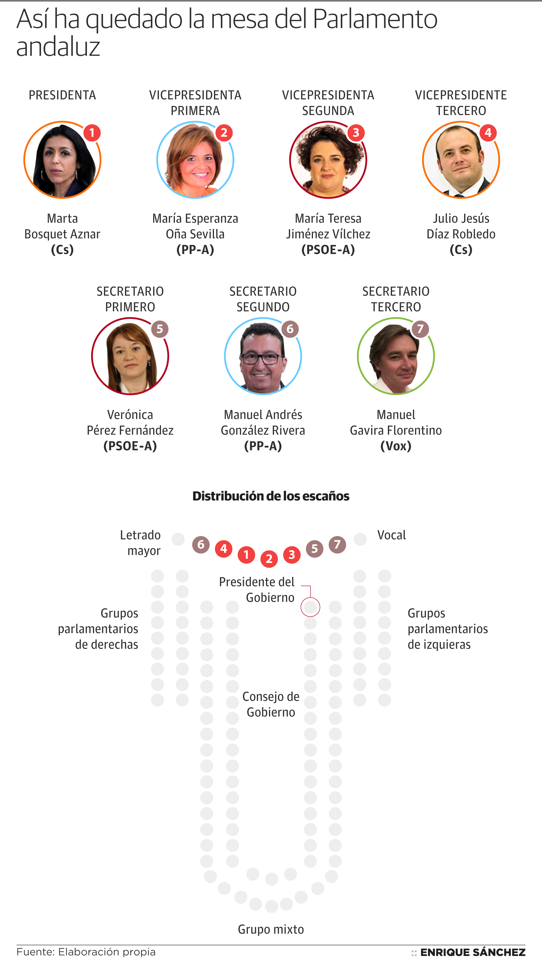 El pleno siguió el guion previsto. Se confirmó la renuncia de Adelante Andalucía a aceptar el puesto en la Mesa que le cedía Ciudadanos sin reclamar nada a cambio, pero usándoles para presumir de pluralidad y blanquear el acuerdo con Vox. Un entendimiento que incomoda a los liberales en puertas del ciclo electoral. Además de la Presidencia del Parlamento, el partido que encabeza Juan Marín obtuvo una vicepresidencia, mientras que PSOE y PP se hicieron con las otras dos y otras tantas secretarias.