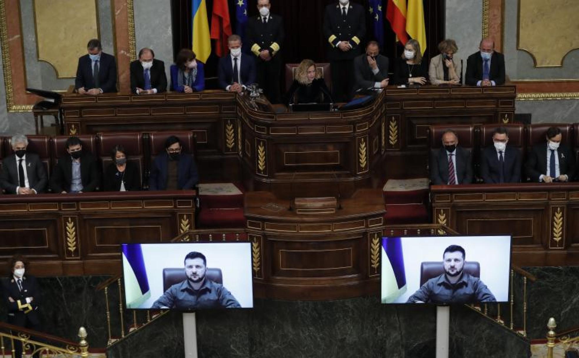 Volodímir Zelenski, presidente de Ucrania, ha intervenido de forma telemática en el Congreso de los Diputados. La sesión especial a la que acudieron tanto diputados como senadores, sólo duró media hora por motivos de seguridad.