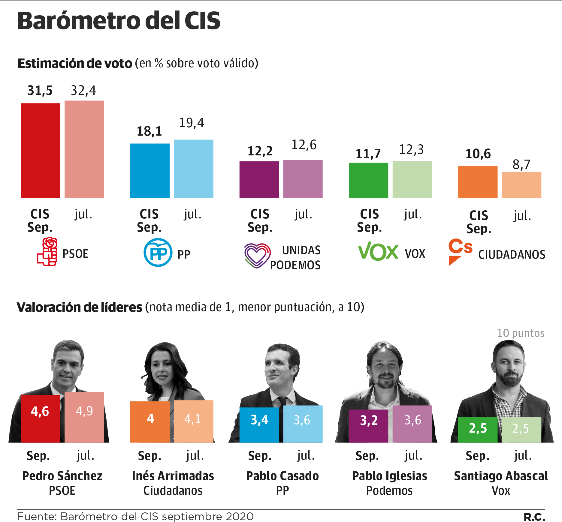 El estudio del CIS se efectuó en la primera semana de septiembre, cuando ya había repuntado la pandemia del coronavirus. El PSOE, de acuerdo al barómetro, retrocede nueve décimas en su estimación de voto respecto a los datos de julio. El PP cae más y pierde 1,3 puntos. También retrocede Unidas Podemos, cuatro décimas al pasar de 12,6 a 12,2. Vox baja seis décimas.