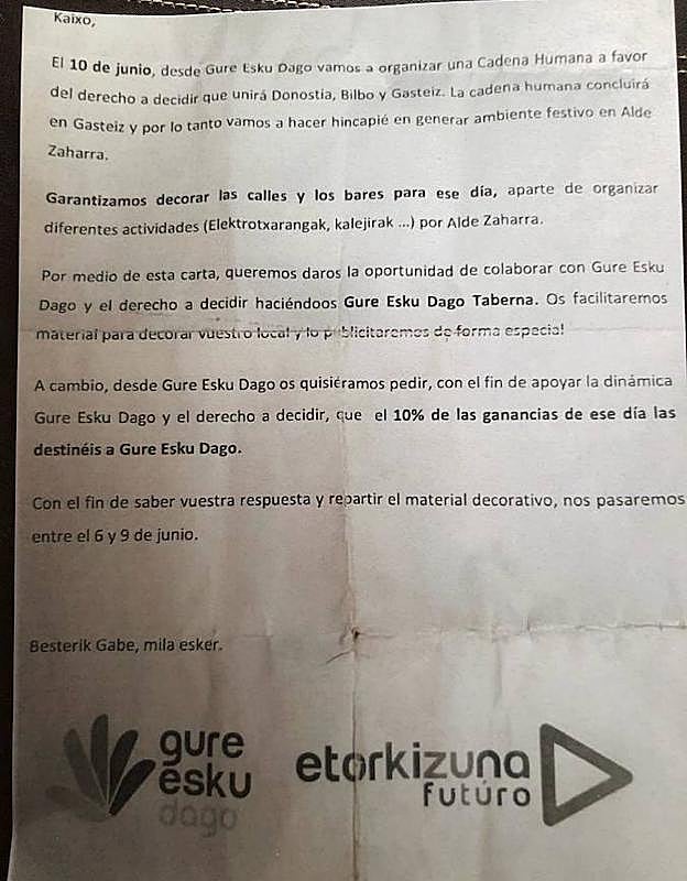 En la misiva, en la que aparece el emblema de Gure Esku Dago, se ofrece a los destinatarios «la oportunidad de colaborar» con esta plataforma, para lo que les propone facilitarles elementos decorativos relacionados con el derecho a decidir y «publicitar» sus locales.