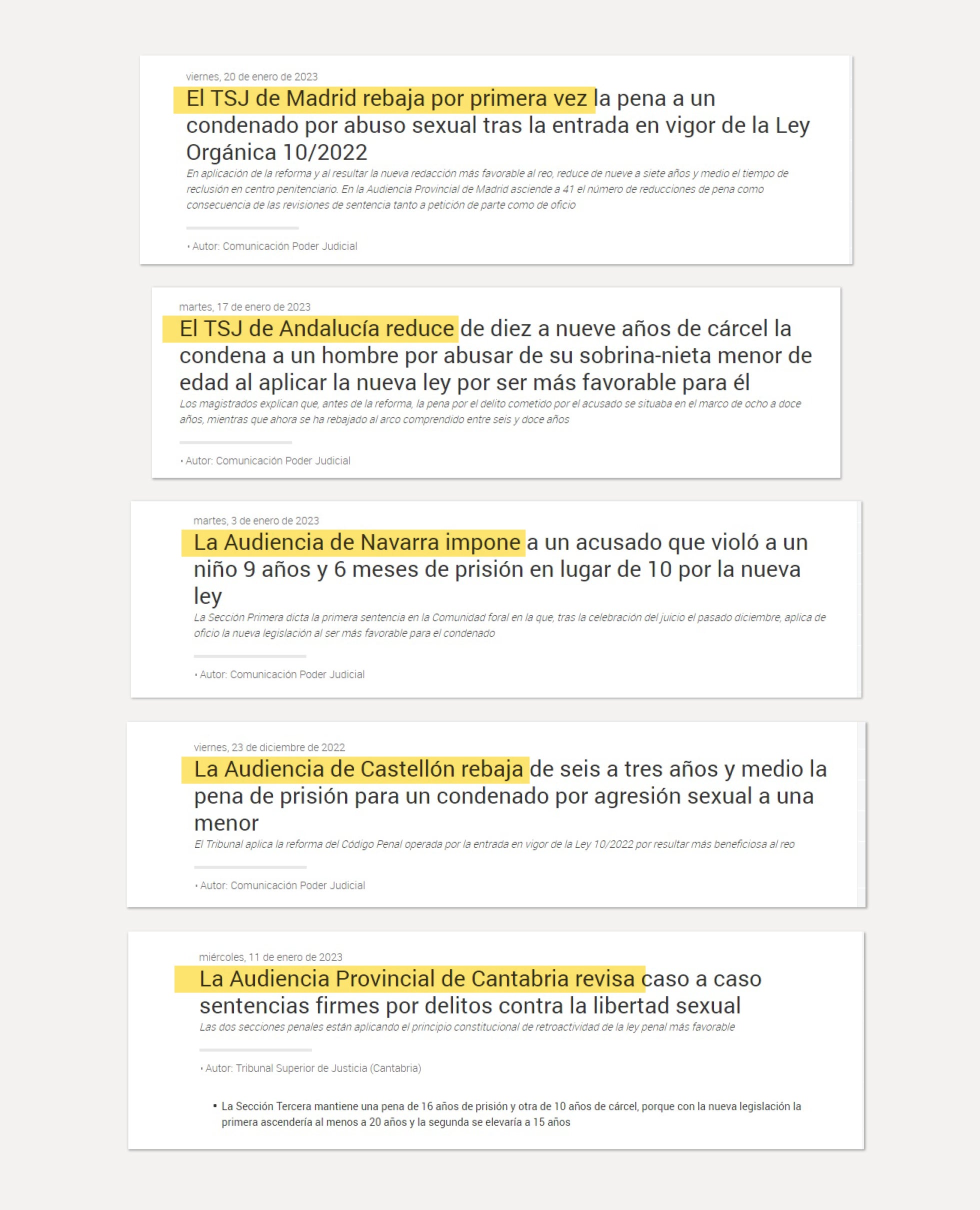 Esta misma semana se ha reducido de nueve a siete años y medio de prisión la condena impuesta a un hombre que abusó de una menor en Murcia. La semana pasada fue puesto en libertad en Lleida un violador múltiple con casi una veintena de agresiones sexuales en su expediente, bajo la advertencia por parte de los servicios penitenciarios de un alto riesgo de reincidencia. En Córdoba se redujo un año de cárcel a un hombre que había abusado sexualmente de la hija menor de su pareja. Algo parecido ha ocurrido en Cantabria, donde una pena de ocho años de prisión pasa a seis años para un hombre que abusó de un chico de catorce años al que obligó a hacerle una felación. Y así hasta más de trescientas reducciones de condena desde la aprobación de la ley.