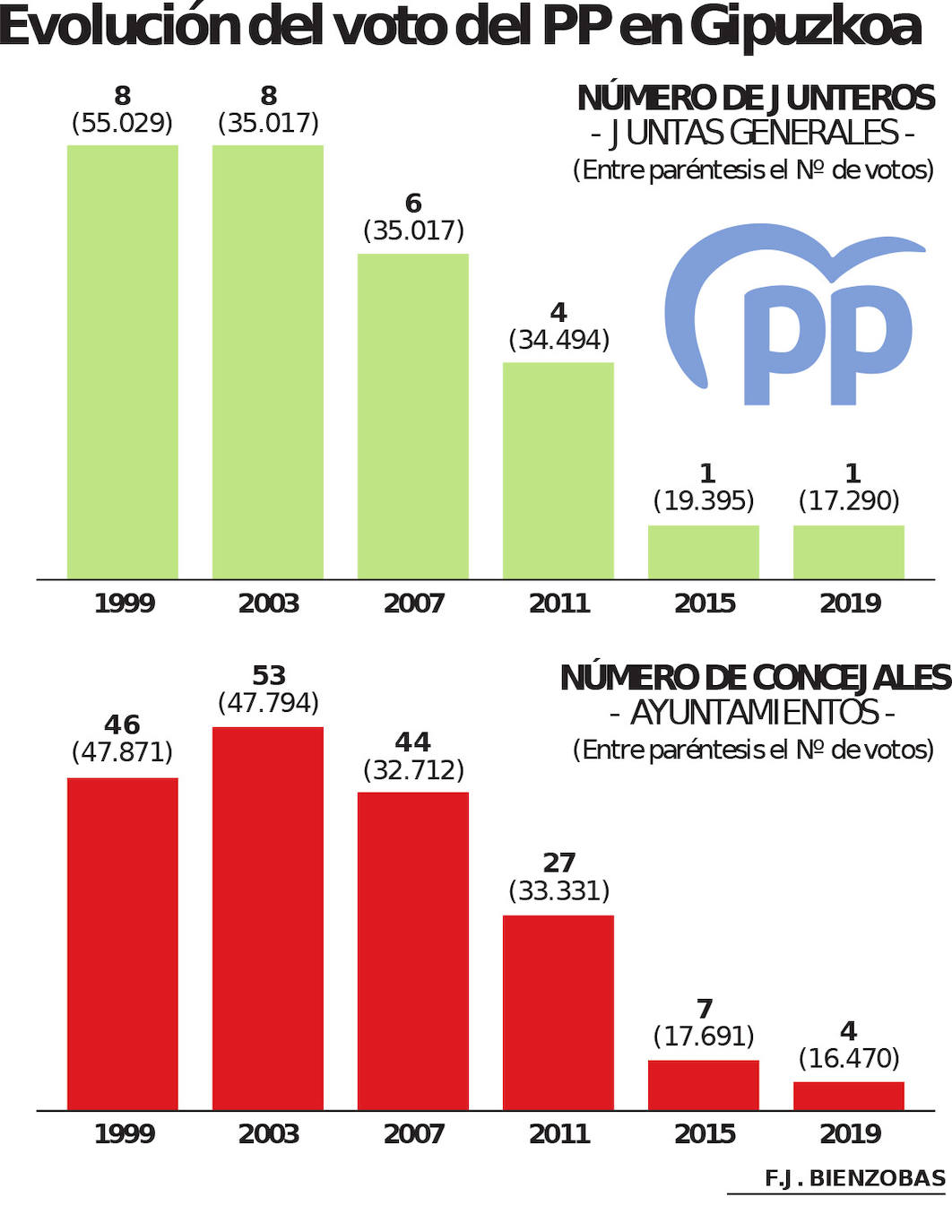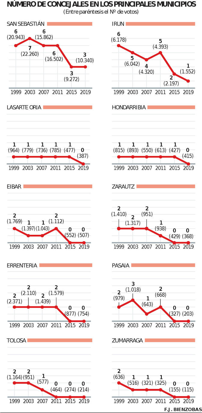 La meta no es otra que intentar reconquistar plazas donde el PP tuvo presencia en pasadas legislaturas y así recuperar parte del terreno que ha perdido en beneficio del PNV. Y ya tienen identificados los nichos donde van a poner el foco para reimplantar su proyecto: en aquellas localidades donde sus políticas se han ido disipando pero creen que tienen un grueso social factible de recuperar. Una maquinaria que ya está en marcha para intentar revertir la curva en negativo que ofrecen los gráficos, y es que el PP de Gipuzkoa se ha dejado por el camino en las dos últimas décadas 42 concejales, 7 junteros y 31.401 votos. Y el contraste roza lo alarmante. Si en 1999 tenían 54 cargos públicos, hoy solo cuentan con cinco representantes en el territorio.