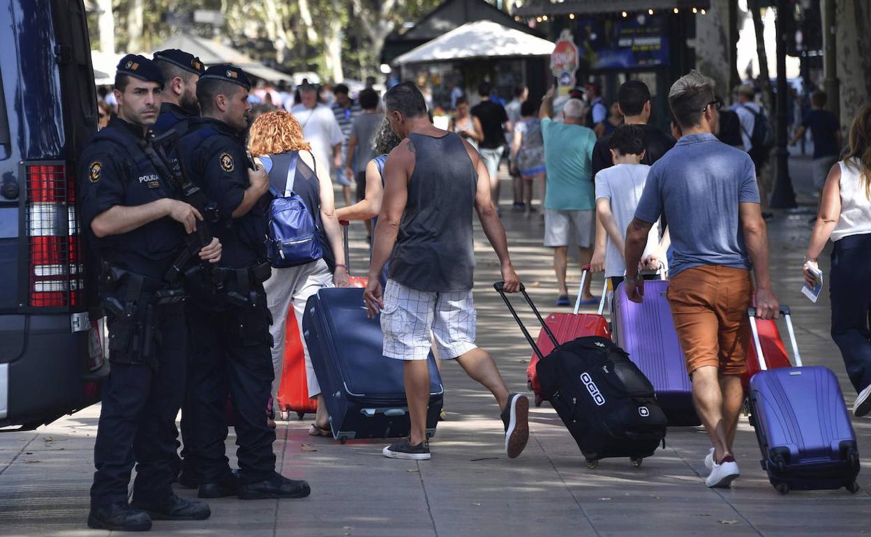 Agentes de policía vigilan La Rambla mientras un grupo de turistas pasa con maletas. Pascal Guyot (Efe)