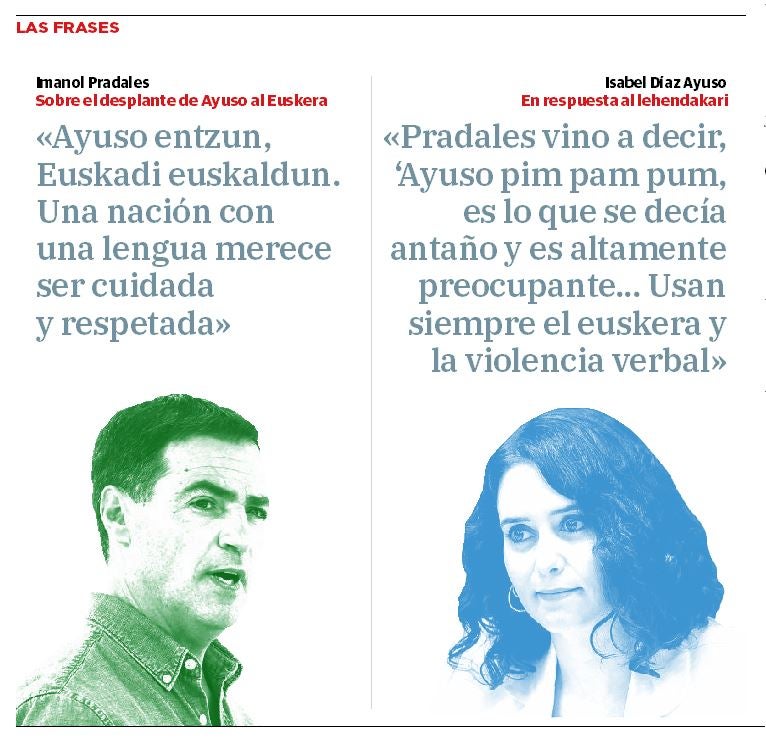 La polémica surge tras defender Pradales el euskera el domingo, en el Alderdi Eguna del PNV, al grito de «Ayuso, entzun, Euskadi euskaldun» ('Ayuso, escucha, Euskadi es euskaldun'). La líder madrileña interpretó ayer estas palabras como «Ayuso, entzun, pim pam pum», en alusión a las amenazas que se vertían en tiempos de ETA. Tanto el PNV como EH Bildu y los socialistas acusaron ayer a Díaz Ayuso de «manipular».