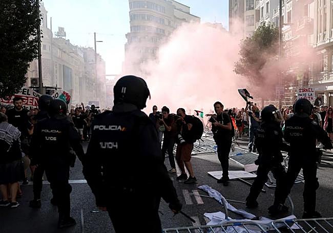 La tensión estaba garantizada toda vez que decenas de organizaciones propalestinas, con el apoyo del Gobierno y todos los partidos políticos de la izquierda, habían llamado a tomar las calles de la capital española para tratar de reventar la etapa final. Siguiendo la estela de lo ocurrido en anteriores jornadas, en las que la organización se vio obligada a acortar la ruta por motivos de seguridad, los manifestantes tenían la intención de impedir como fuera el paso de los ciclistas para boicotear la participación del equipo Israel-Premier Tech, al que vinculan directamente con la masacre del Estado judío en Gaza.