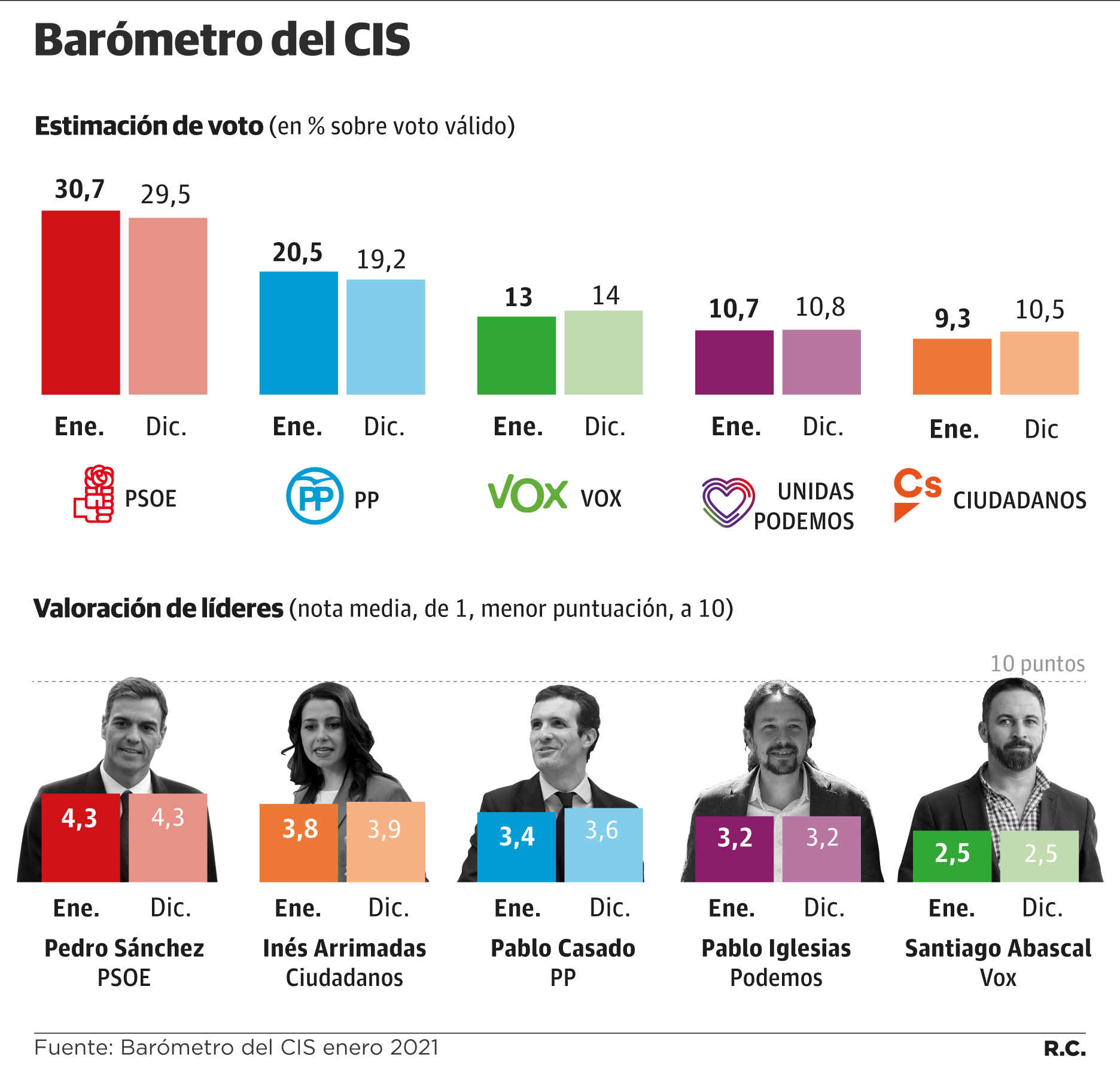 El barómetro del CIS de enero, realizado entre el 7 y 25 de enero, en plena tercera ola de la pandemia, refleja que PSOE y PP fortalecerían sus estimaciones de voto si se celebrasen ahora las elecciones generales. Los socialistas obtendrían el 30,7% de los votos y los populares, el 20,5%. Ambos crecen más de un punto respecto al estudio del mes pasado. Una mejoría de las expectativas cimentada a costa de Vox y Ciudadanos, que retroceden casi lo mismo que ganan PSOE y PP.