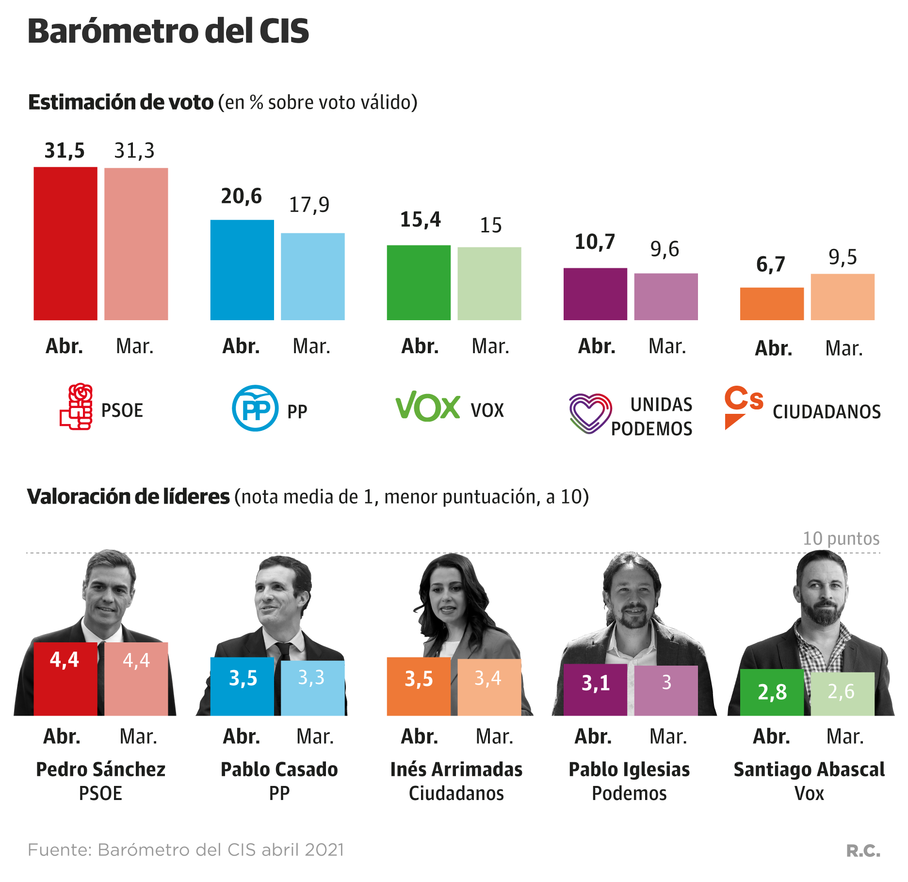 En cuanto a la valoración de los diferentes líderes, Sánchez sigue en cabeza y repite la nota de 4,4 puntos (sobre 10) que ya cosechó en marzo. Le sigue el presidente del Partido Popular, Pablo Casado, que mejora en dos décimas la opinión que los encuestados tienen de su perfil y lo califican con 3,5 puntos. Misma nota que obtiene la líder de Ciudadanos, Inés Arrimadas, que solo sube una décima respecto a marzo. Por último, Pablo Iglesias (Podemos) y Santiago Abascal (Vox), con un 3,1 y un 2,8 respectivamente (ambos suben).