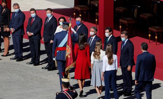 No hubo contratiempos ni tampoco tensiones. Aunque de haber habido malas caras, las mascarillas se encargaron de esconderlas. La celebración del Día de la Fiesta Nacional sirvió de escenario para el primer encuentro entre el Rey y Pablo Iglesias, después de la ofensiva parlamentaria contra la Corona iniciada por Unidas Podemos y tras las críticas del líder morado a Felipe VI el pasado 25 de septiembre. Ese día, el monarca no acudió a la entrega de diplomas a la nueva promoción de jueces en Barcelona, vetado por el Gobierno. Una ausencia que desató una tormenta en el Poder Judicial y que tensionó las relaciones con la Zarzuela.