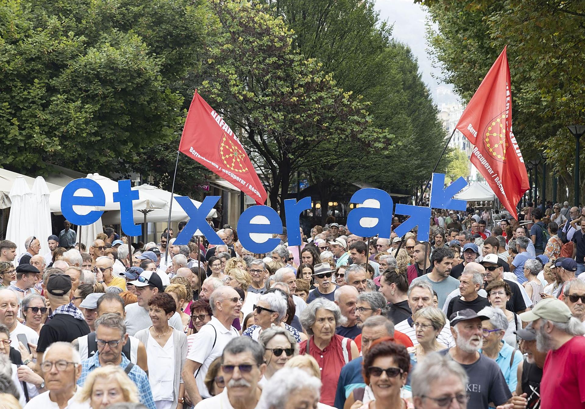 El portavoz de Sare, Beñat Uribe-Etxeberria, ha señalado al término de la movolización que con esta manifestación se pretende «incorporar la reivindicación» en estos días de fiesta. Por ello, en un ambiente festivo y bajo el lema 'Etxera', con música y un grupo de zanpanzar a la cabeza, la marcha ha arrancado desde el Boulevard donostiarra y ha recorrido las calles del centro de la ciudad hasta llegar al puerto. Antes de finalizar, la red ciudadana, que este verano ha cumplido once años de existencia, ha recordado también que ha decorado muchos rincones de Donostia con «pancartas legítimas».