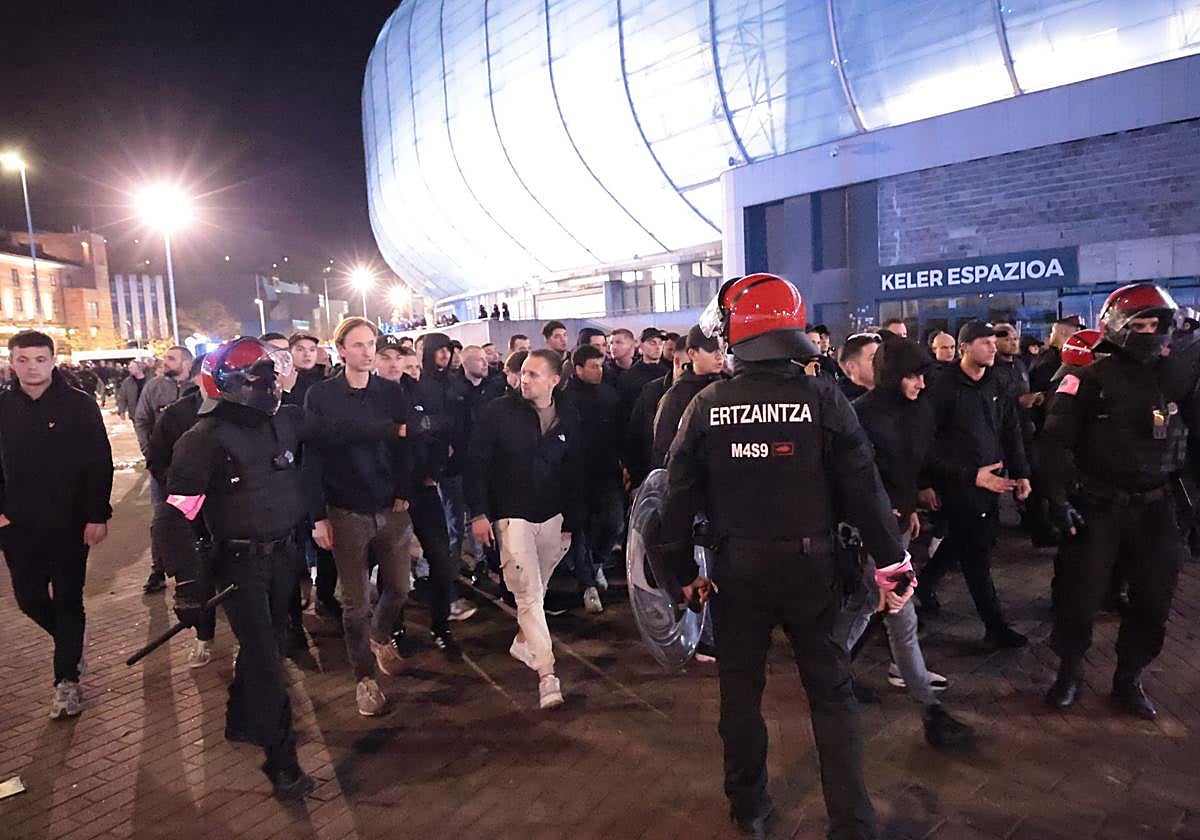 Los seguidores del Ajax no han acudido al punto de encuentro en el Kursaal y han ido llegando a Anoeta en diferentes grupos. El más numeroso, de unos 300, ha llegado escoltado por la Ertzaintza tras algún incidente leve