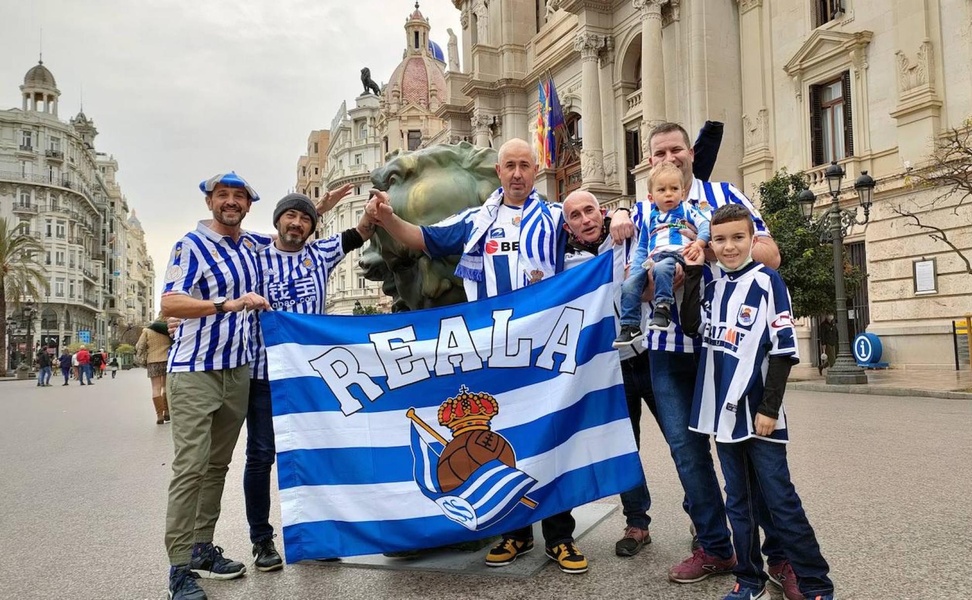 El fútbol queda en un segundo plano, de no ser porque irrumpe en la plaza un grupo de valencianos vestidos de blanquiazul. Más falleros que nadie pero con una pasión txuri-urdin de la que presumen orgullosos desde hace cuatro décadas. Se enamoraron de la Real con el equipo campeón de los ochenta, que aportaba la columna vertebral de la selección que jugó en Valencia el Mundial 82. Eran niños entregados al fútbol de los Arconada, Zamora, López Ufarte, Satrústegui y compañía, que aprendieron a amar unos colores desde la lejanía y ahora han transmitido esa religión a sus hijos.