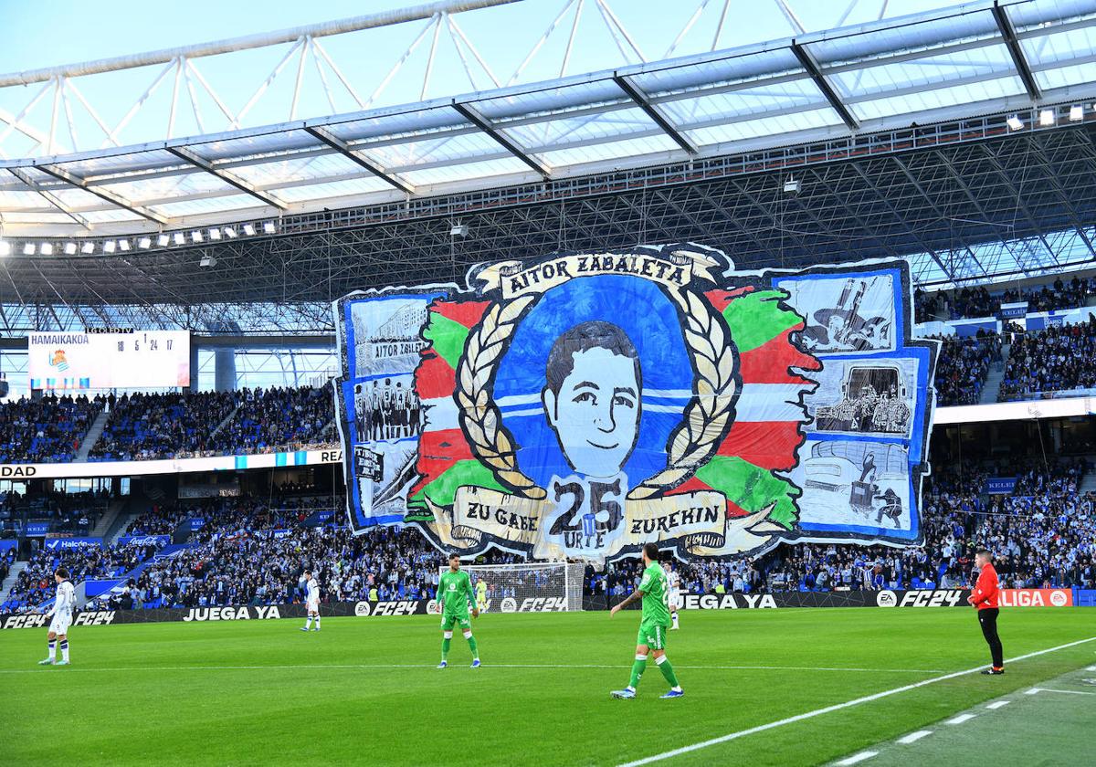 Tanto en el exterior como en el interior del Reale Arena se llevaron a cabo diversos actos en recuerdo de su figura y la afición estuvo a la alturaHan pasado 25 años y lo que está claro es que pasarán otros tantos y Aitor Zabaleta no se le va a borrar de la memoria a la afición txuri-urdin. Su noble y humilde figura sigue estando tan presente como si hubiera sido asesinado hace pocos días. La afición realista, que seguramente hubiera preferido acudir a tomar algo con sus amigos antes a un homenaje de un hecho que nunca debió suceder, volvió a estar a la altura para brindarle un sentido recuerdo al seguidor realista tanto en el exterior como en el interior del Reale Arena.