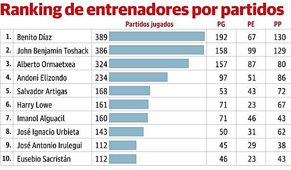 Entrenador Partidos PG PE PP % de Victorias Benito Díaz 389 192 67 130 x John 386 158 99 129 x Alberto Ormaetxea 324 157 87 87 x Andoni Elizondo 234 97 51 86 x Salvador Artigas 168 53 43 72 x Harry Lowe 161 71 23 67 x Imanol Alguacil 160 71 46 43 x José Ignacio Urbieta 143 50 31 62 x Irulegui 112 45 29 38 Eusebio Sacristán 112 46 23 43 x