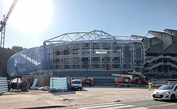 Además, los trabajos para rematar la colocación del ETFE en la grada Aitor Zabaleta continúan y los esfuerzos se centran en la instalación del plástico azul en la esquina más cercana al palacio de hielo Txuri-Urdin.