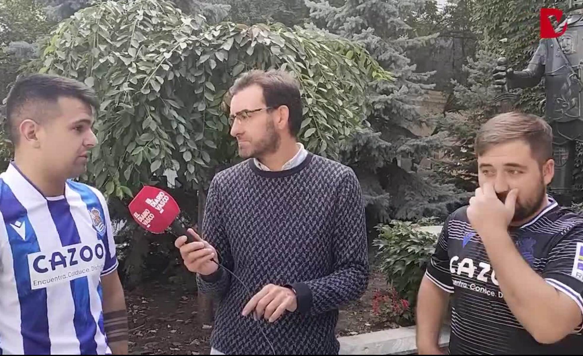 Oier y Yokoy, dos de los 15 aficionados que acompañarán esta tarde a la Real Sociedad en el Zimbru Stadium, hablan con Miguel González, enviado especial de El Diario Vasco