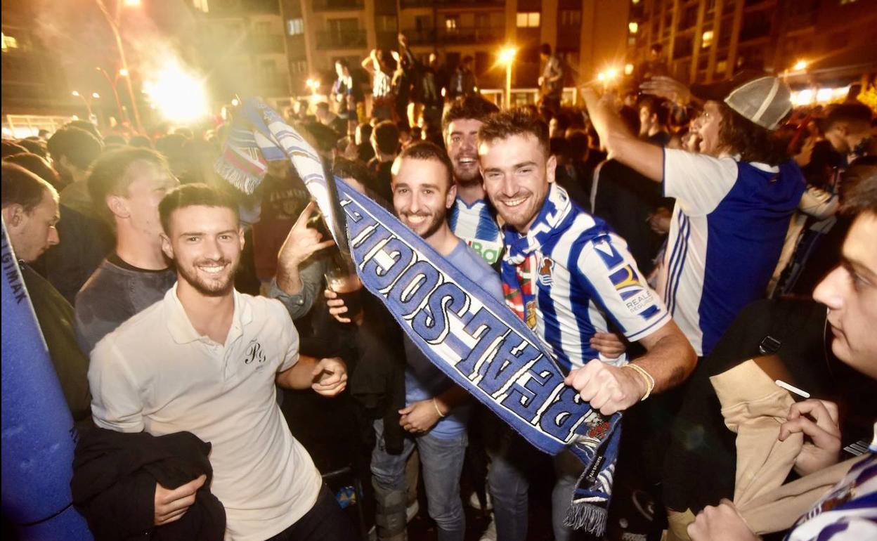Sobre todo se han visto grupos ataviados con toda la indumentaria txuri-urdin cantando canciones como el 'goazen erreala goazen txapeldun', aunque también hay seguidores del conjunto bilbaíno entonando canciones de su equipo.