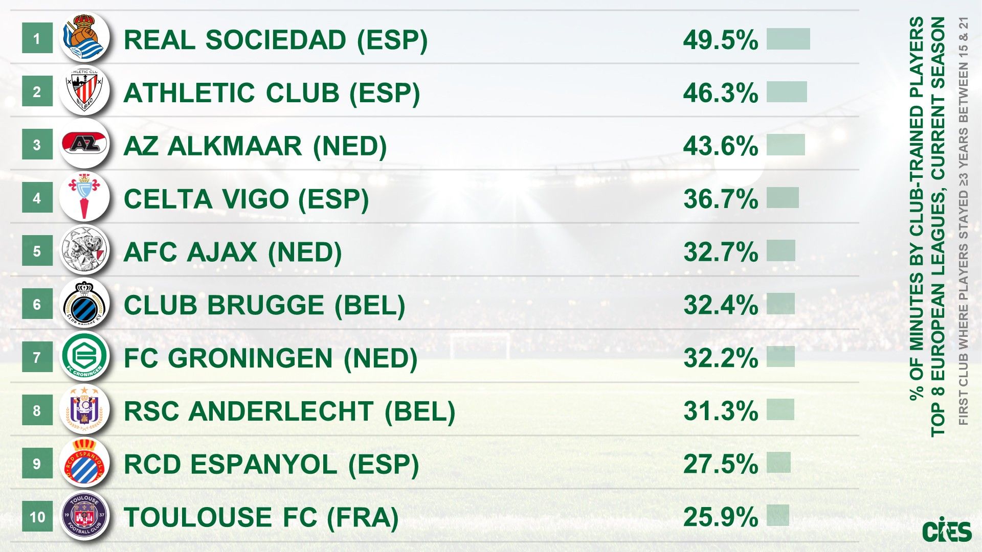 CIES cifra en un 49,5% la participación de los jugadores de cantera de la Real Sociedad esta temporada. Por detrás, figuran el Athletic en segunda posición (46,3%), el AZ Alkmaar de la Eredivisie (43,6%), el Celta (36,7%) y el Ajax de Amsterdam (32,7%). Se considera formador a aquel club en el que ha militado un futbolista durante un mínimo de tres años entre los 15 y los 12.