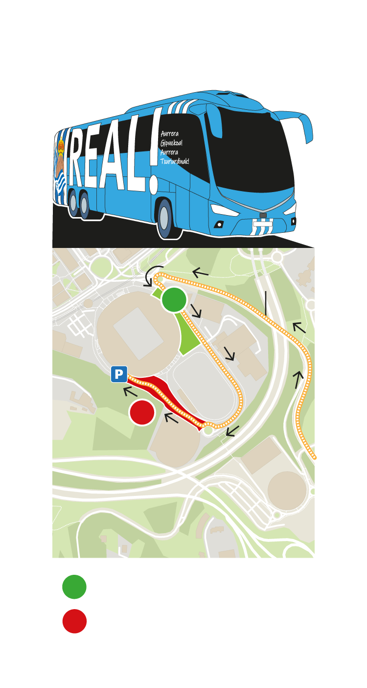 Al igual que ante el conjunto blanco habrá dos zonas para recibir al equipo, que bajará en autocar desde la zona de Hospitales. El bus girará en la primera rotonda y encarará la recta del Txuri Urdin, lugar donde comenzará el primer tramo del recibimiento y que llegará hasta el polideportivo Paco Yoldi.
