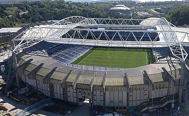 13:30 h. El estadio de Anoeta presenta desde la torre ubicada junto al mismo un aspecto fenomenal. La afición txuri-urdin se prepara para vivir una gran jornada de fútbol en un campo prácticamente nuevo, aunque aún en obras.