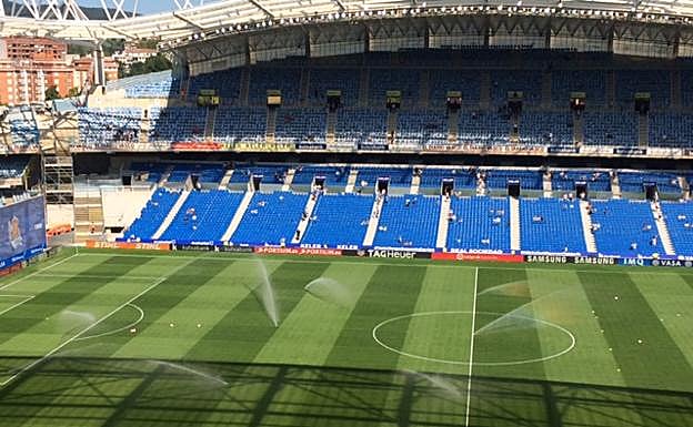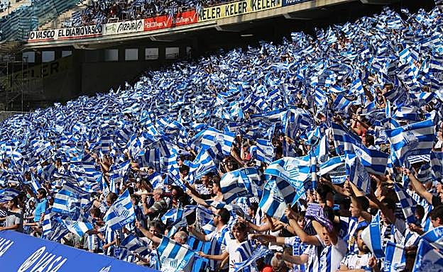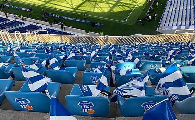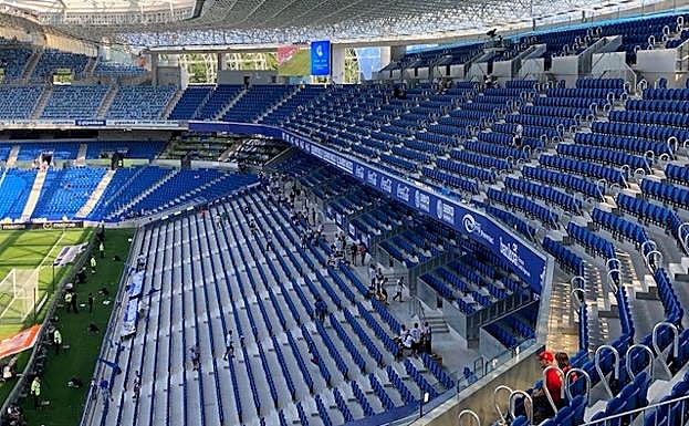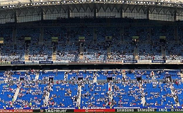 15:05 h. La Real Sociedad ha colocado banderines en todos los asientos de las zonas superiores de las tribuna principal y este: