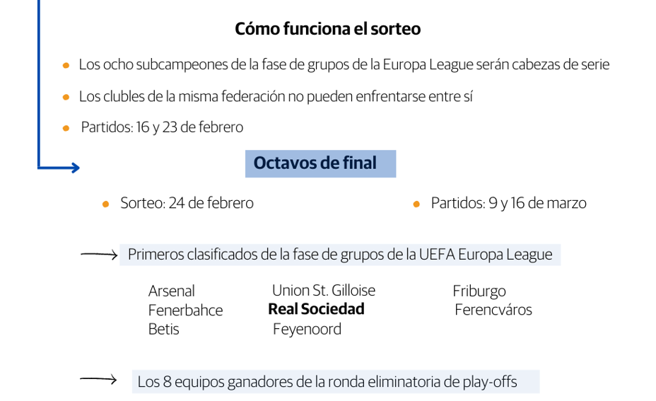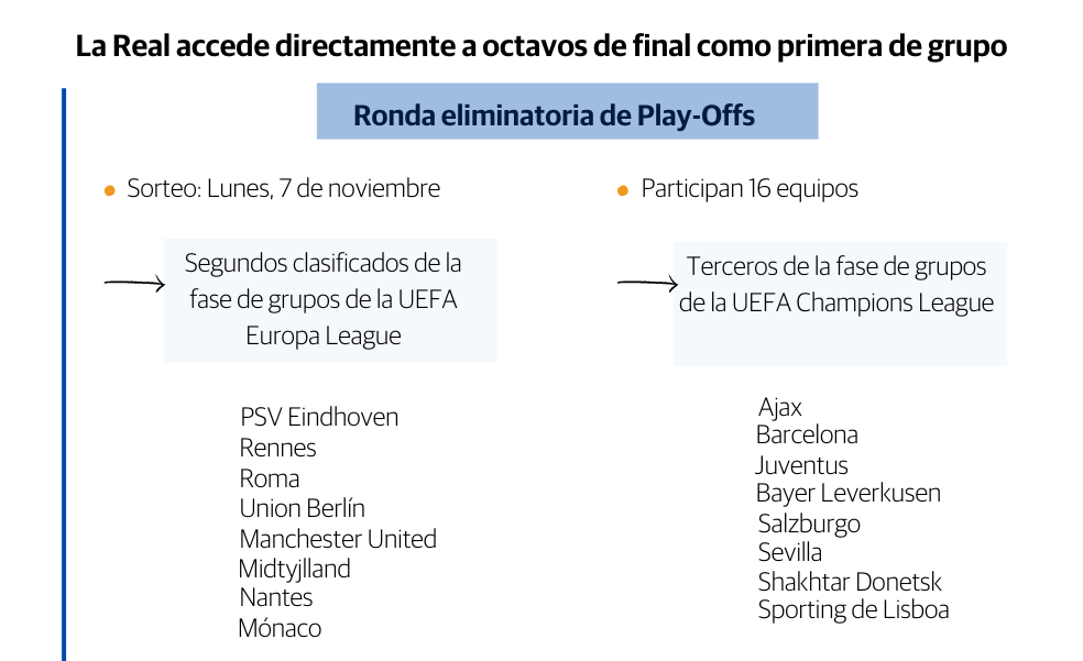 Los partidos de la ronda eliminatoria de play-offs se jugarán a doble partido el 16 y 23 de febrero, y los octavos de final (en esta ronda entra la Real) se disputarán el 9 y 16 de marzo de 2023. El sorteo de la eliminatoria de play-offs de la Europa League será el próximo lunes, 7 de noviembre.