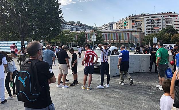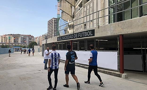 16.50 h: Siguen llegando aficionados a Anoeta. Todos observan el aspecto del campo por fuera.