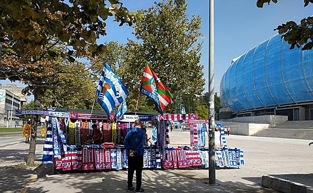 16.10 h: No hay mucho movimiento todavía en la habitual tienda situada junto a la parada del Topo. Hoy, además, se repartirán en las inmediaciones del campo más de 30.000 bufandas para dar color al nuevo Anoeta.