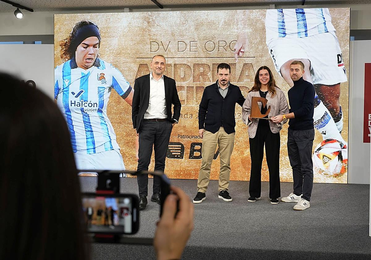 Andreia Jacinto recoge el testigo de Amaiur y obtiene el reconocimiento de El Diario Vasco a la mejor jugadora del curso pasado en el 90 aniversario del periódicoAndreia Jacinto ha recogido el testigo de Amaiur Sarriegi y ya muestra orgullosa el DV de Oro obtenido gracias a su buen hacer la pasada temporada en la Real. Nadie obtuvo más puntos que la portuguesa en el cómputo global de la campaña. Nadie fue más regular y constante que la centrocampista txuri-urdin.