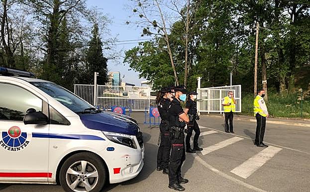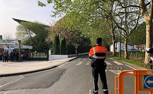 09.30: Hay un fuerte dispositivo de seguridad para controlar el acceso a Zubieta tanto desde Lasarte como desde Bugati. Comienzan a llegar las primeras oleadas de seguidores txuri-urdin con el objetivo de apoyar al equipo. En la imagen, uno de los tramos restringidos desde el hipódromo.
