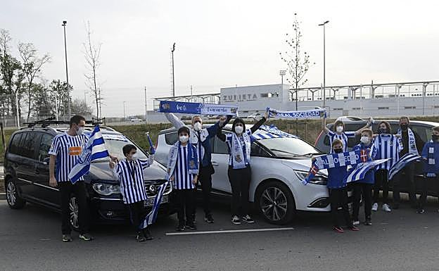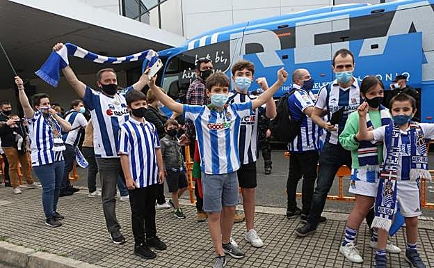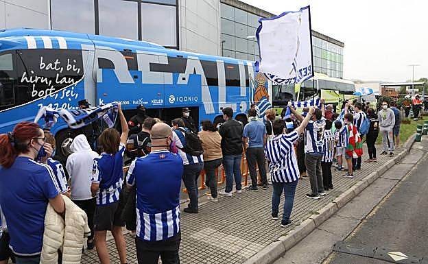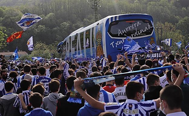 10.37: Ante el gran recibimiento, los futbolistas txuri-urdin se han acercado a la valla para saludar a la afición, ese jugador número 12 que no podrá acudir a Sevilla por las restricciones establecidas por la pandemia del Covid-19.
