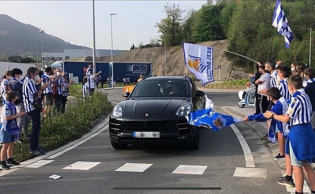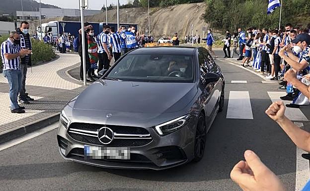 10.03: Los aficionados txuri-urdin han rodeado los accesos a Zubieta para recibir al equipo y están apladuendi la llegada de todos los jugadores a una hora de que salgan camino del aeropuerto de Hondarribia.