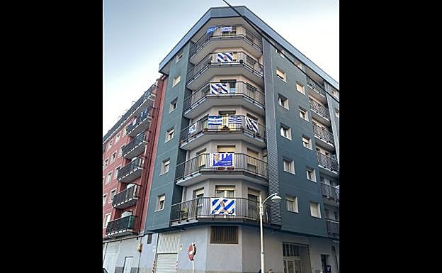 15.05: los vecinos de un bloque del centro de Donostia han colgado una espectacular bandera txuri-urdin del último piso al primero que da un color especial a la Avenida de Donostia.