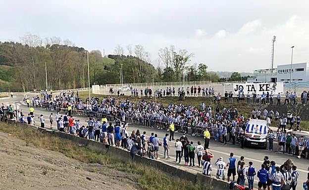 10.40: Apenas quedan cinco minutos para que parta la expedicion de la Real a Hondarribia. Las inmediaciones de Zubieta están llenas de aficionados que han querido mostrar su apoyo al equipo.