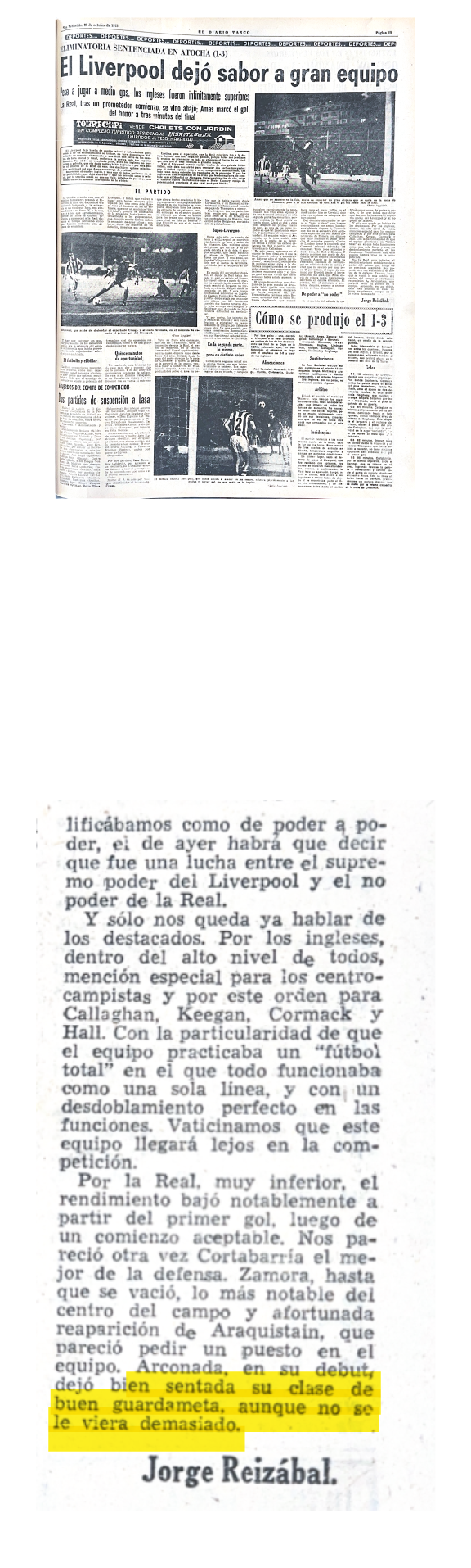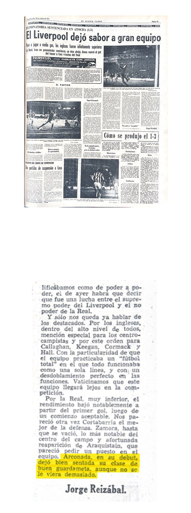 Llegaban los Clemence, Hughes, Keegan, Callaghan, Toshack o Heighway, dirigidos por Bob Paisley, una sucesión de estrellas que iban a ser testigos del nacimiento de otro ser de su misma especie en las filas locales. Elizondo había introducido cambios en la formación. En la portería entraba un joven donostiarra de 21 años en sustitución de Javier Urrutikoetxea. Se trataba de Luis Arconada.