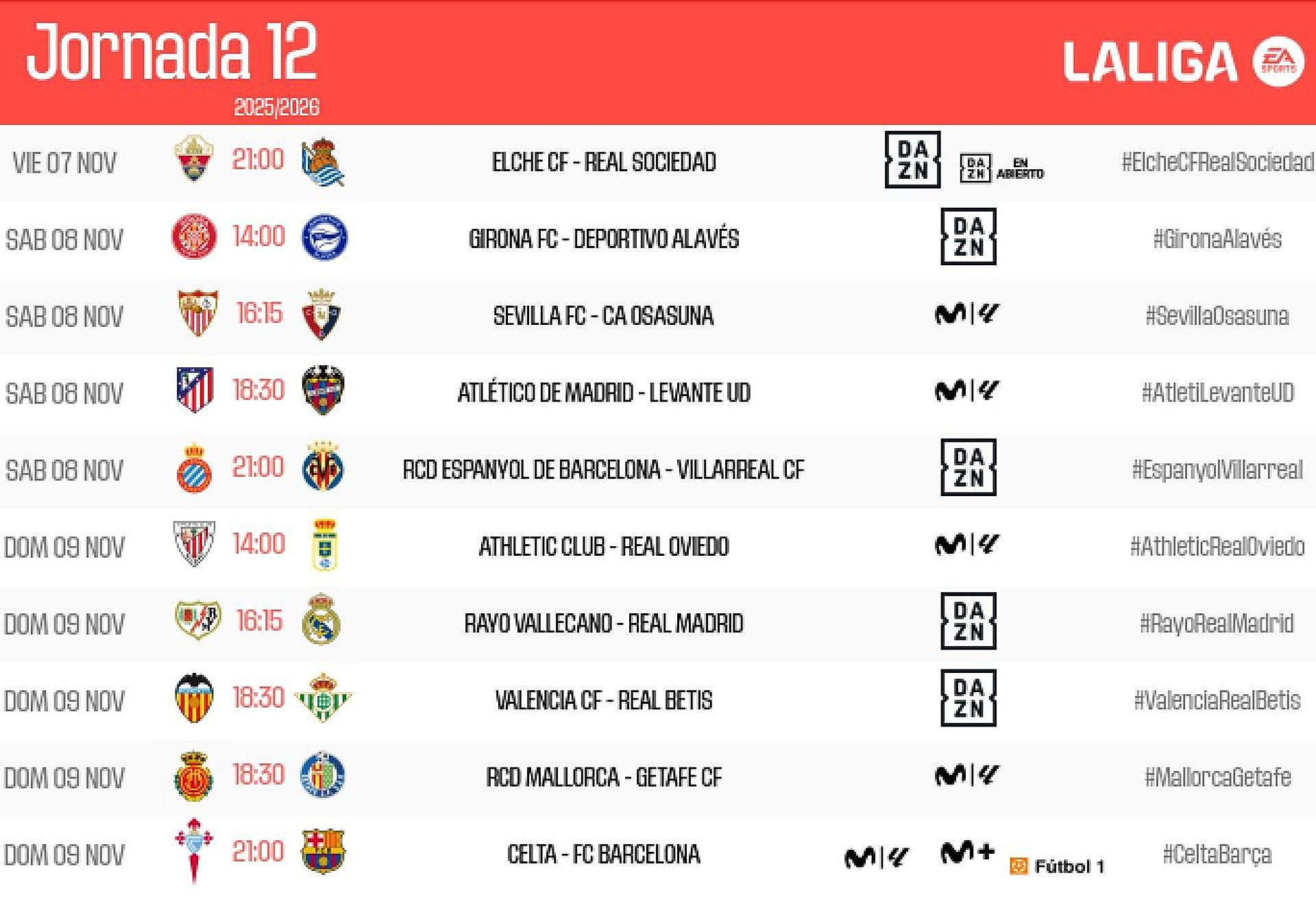 El encuentro ante el Elche en el Martínez Valero será el primero de la jornada 12, se adelanta al viernes 7 (21 horas) y será el quinto y último encuentro entre parones