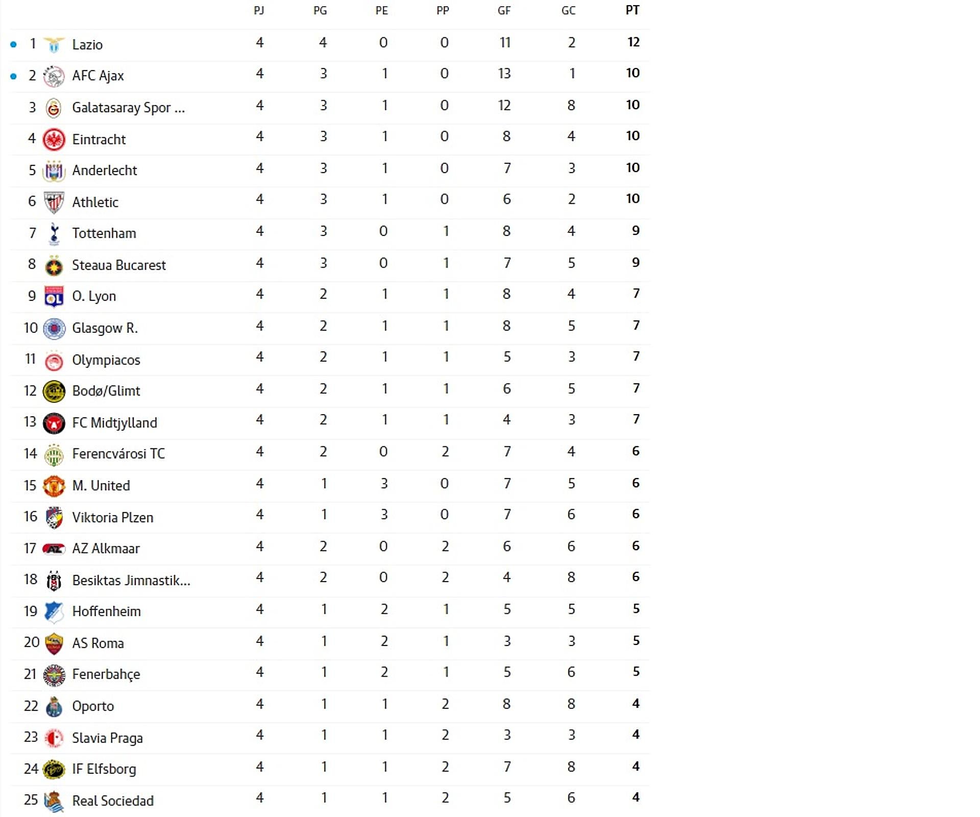 La Real ocupa el puesto 25º de los 36 que componen la liguilla de la Europa League: dos victorias en cuatro partidos le valen para clasificarse, pero ya es una quimera hacerlo entre los ocho primeros