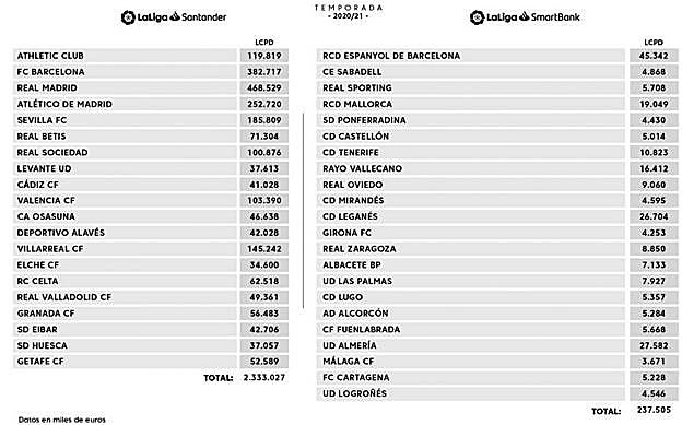 Tras el fuerte impacto socioeconómico de la crisis sanitaria internacional, LaLiga redujo a la mitad el límite del coste de la plantilla deportiva del Barcelona, de los 671,4 millones de euros de tope que tenía en la temporada 2019-20, a los 382,78 millones de esta temporada (el 57%), y en un 25% al Real Madrid, de los 641 millones del curso anterior a 468,5 millones. Dos descensos muy importantes en el potencial financiero de los dos colosos de la Liga, que van a tener que apretarse mucho el cinturón para poder cuadrar sus cuentas.