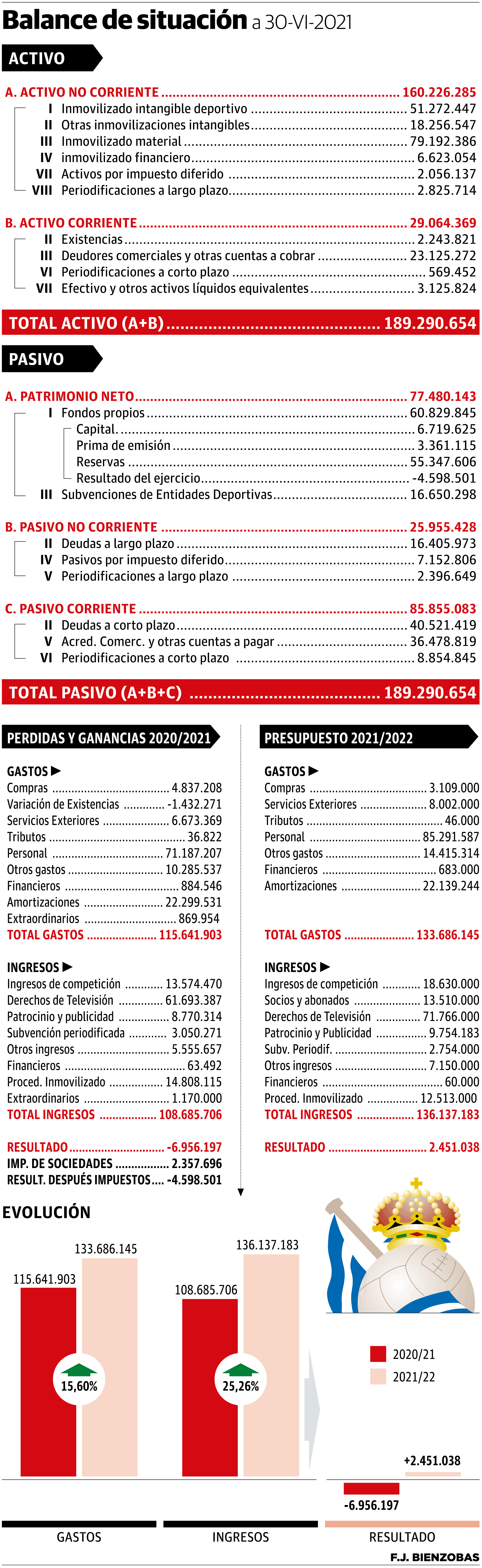 Pese a todo, la Real cerró el pasado ejercicio a 30 de junio de 2021 con una pérdida de 4,5 millones después de impuestos, porque hay que devengar 2,3 millones del impuesto de sociedades al haber pagado más en otros ejercicios entre los 115 millones gastados y los 108 ingresados. Y eso después de hacer frente a los compromisos contractuales adquiridos con los jugadores y mantener el empleo del 100% de la plantilla no deportiva.