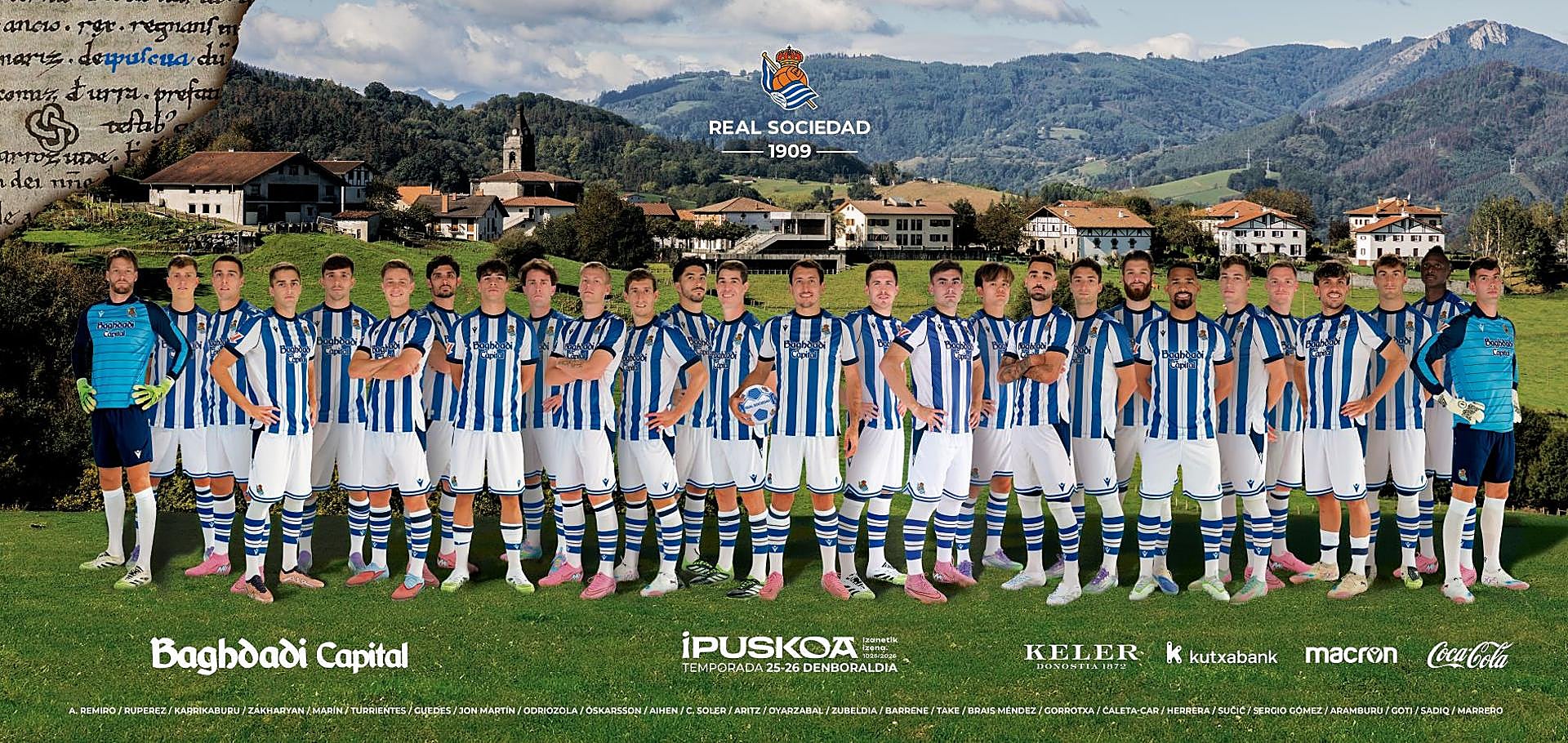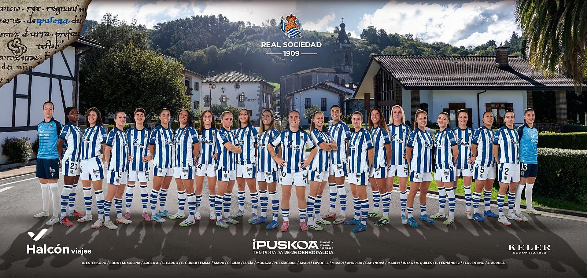 La Real Sociedad ha presentado las imágenes de familia del equipo masculino y femenino de la temporada 2025-2026 en los que rinde homenaje a Ipuskoa por hacer mil años desde su descubrimiento.