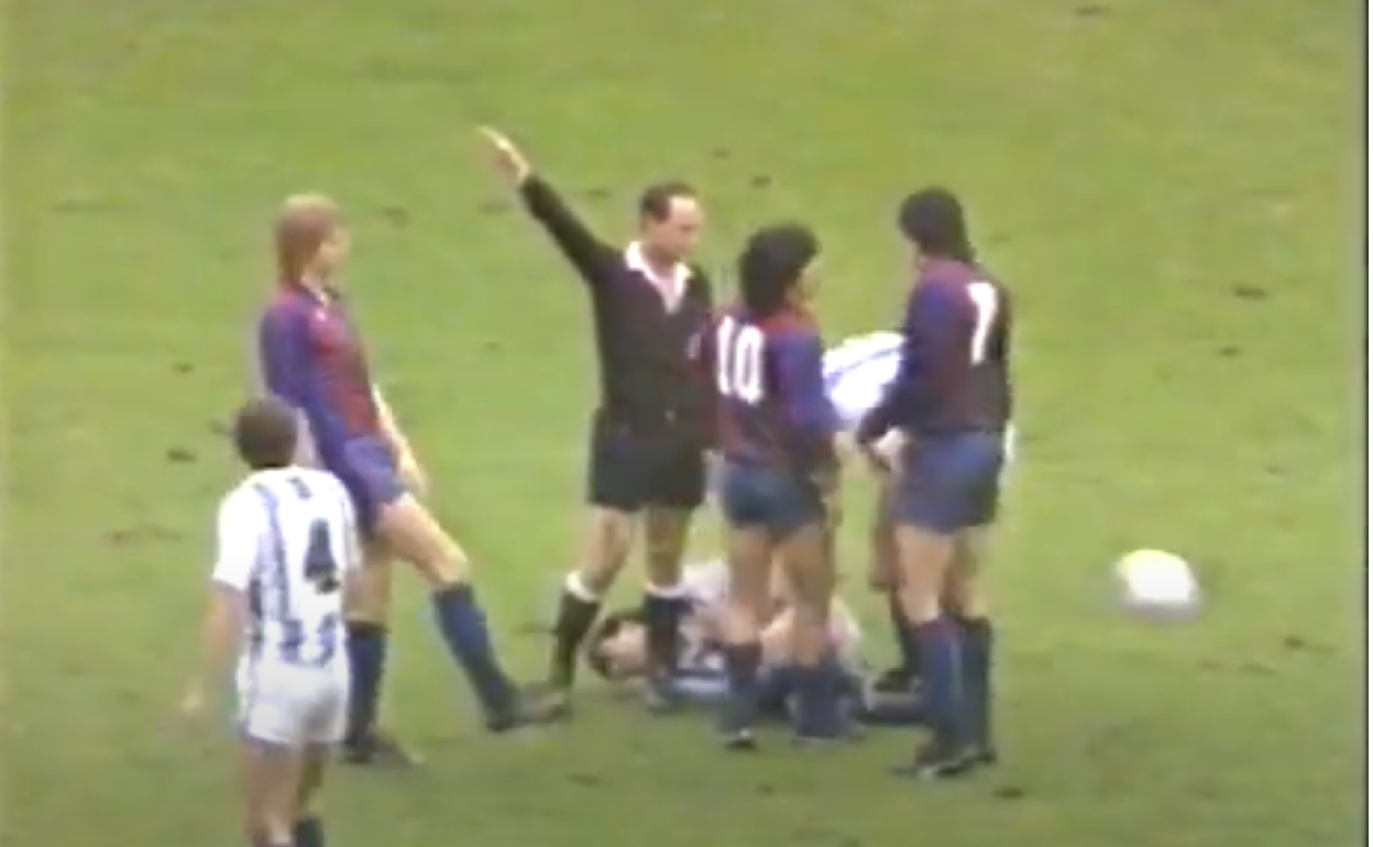 El Barcelona cayó por 1-0 gracias a un gol de Peio Uralde. Pero como no podía ser de otra manera uno de los protagonistas fue el astro argentino. El de Lanús se las tuvo que ver con defensas como Diego, Olaizola Gajate. Duros, pero nobles entradas. Maradona caía al barro pero enseguida se levantaba en busca del balón para intentar la siguiente gambeta con la que dejar sin cintura al defensa. Aquel día no consiguió su propósito.