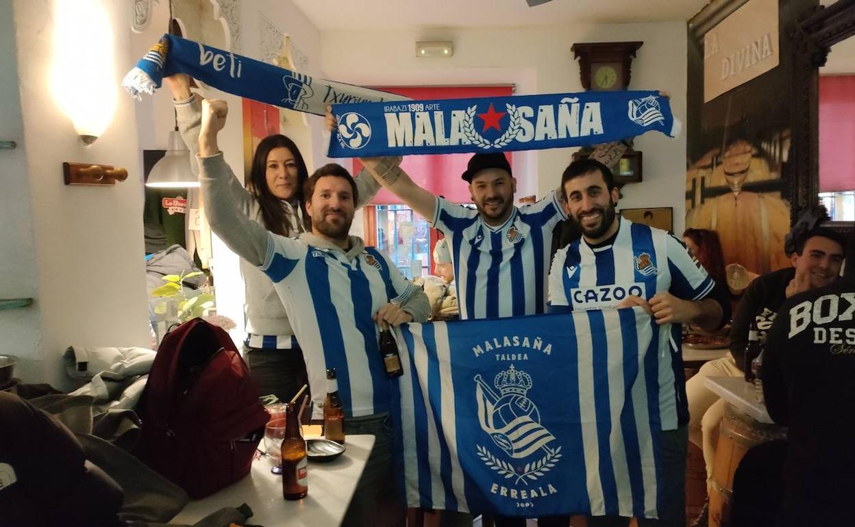 Estos aficionados realistas se unirán en el campo merengue con los hinchas txuri-urdin que se han acercado a la concentración convocada por la peña de la Real en Madrid Malasaña Taldea. La quedada era a las 17.00 horas en la plaza del Dos de Mayo. Partirán hacia el estadio sobre las 19.00 horas para reunirse en la Taberna Volapié en la que es posible que se encuentren con los aficionados de Algorri Taldea de Zumaia que han viajado a Madrid en un autobús.