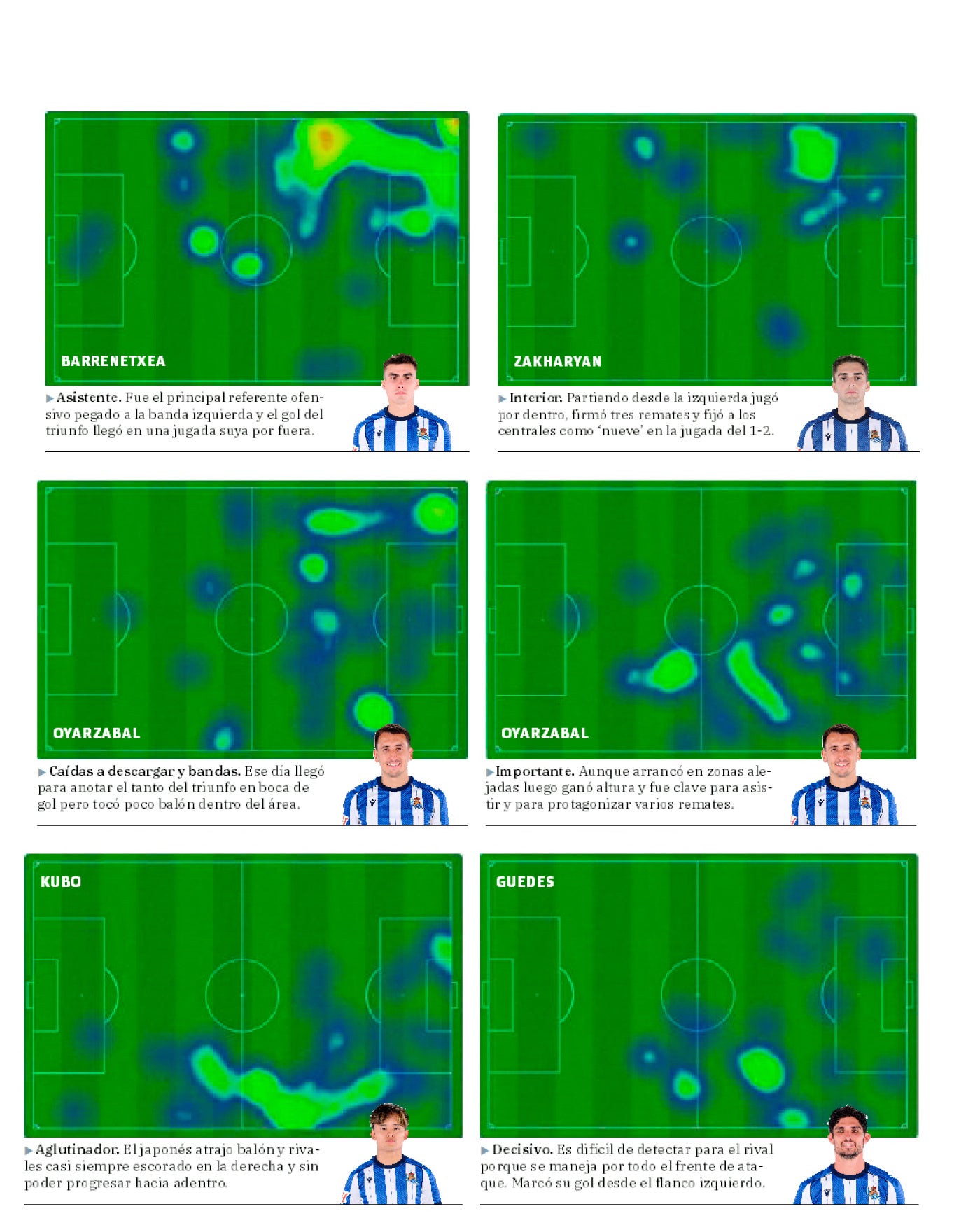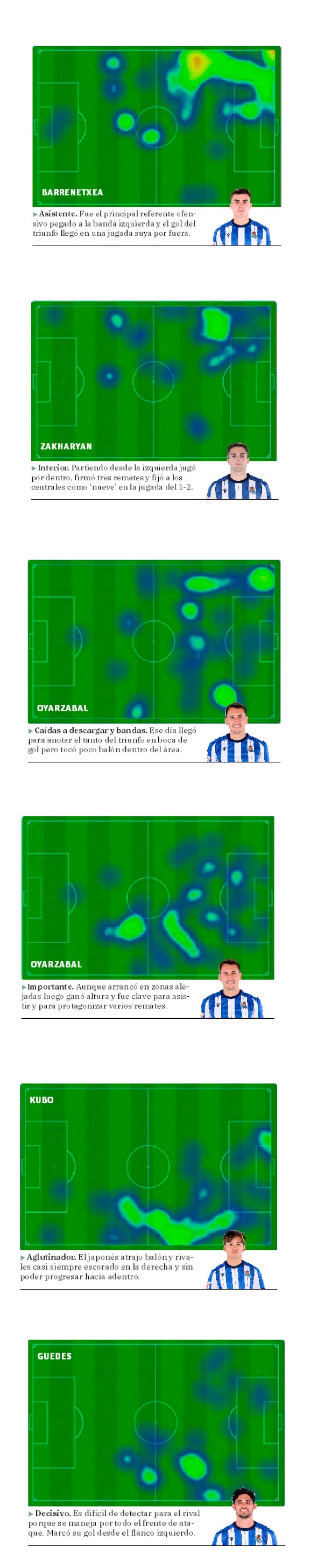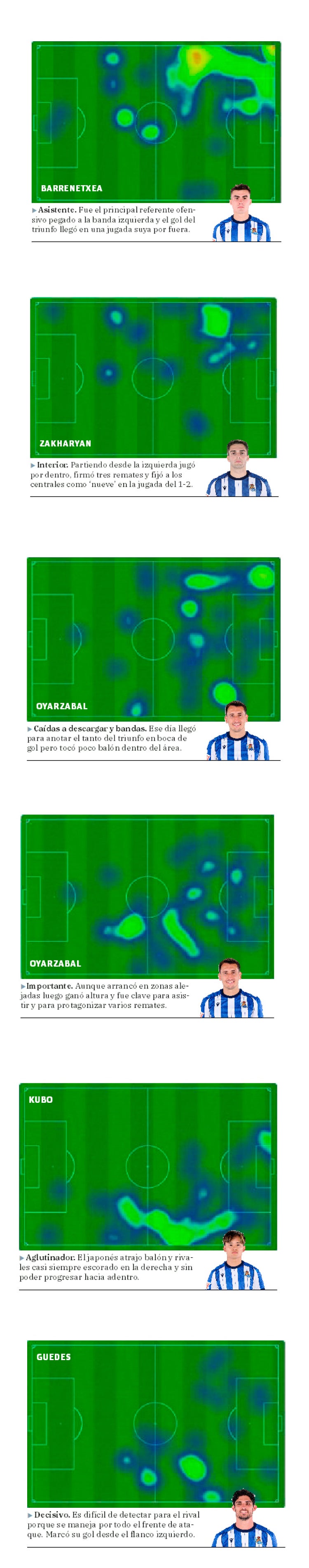 Una comparativa de los mapas de calor del partido de la sexta jornada contra el Mallorca, el último en el que formaron de inicio Kubo, Oyarzabal y Barrenetxea, y los del sábado pasado contra Osasuna muestra una diferencia abismal en la forma de atacar de la Real. En el primero los extremos concentran todo el juego por fuera sin apenas presencia en los pasillos interiores y Oyarzabal apenas pisa el área, cayendo más a descargar entre líneas o a las esquinas para generar superioridades. Al final, el gol del triunfo vino en una jugada individual de Barrene por fuera que empujó el capitán a puerta vacía.