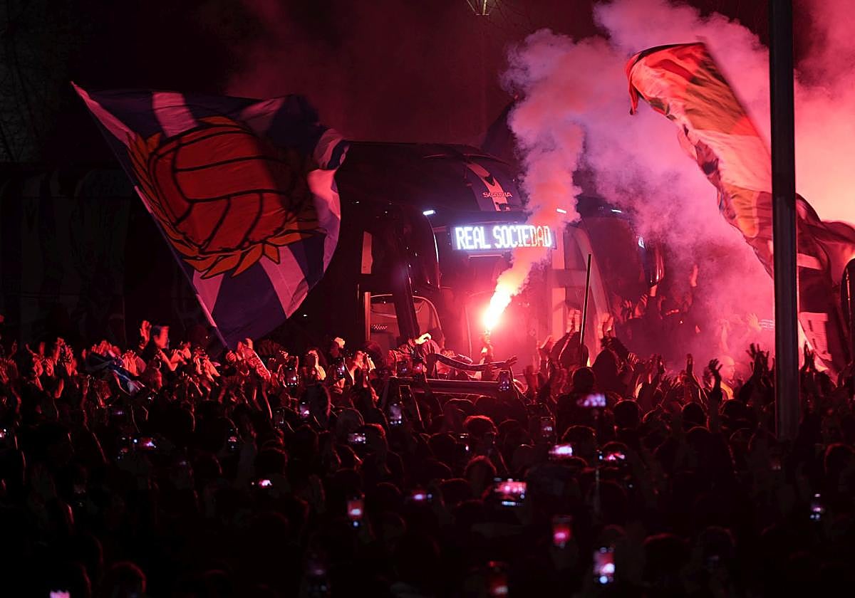 Histórico recibimiento a la Real Sociedad. La afición txuri-urdin volvió ayer a hacer de jugador número 12 en los momentos previos al choque de ida de las semifinales de Copa ante el Real Madrid. Cientos de aficionados se enfundaron la camiseta realista y bufandas en mano y entre bengalas no dudaron en animar y aplaudir al equipo a su llegada al Reale Arena. El ambiente fue inmejorable y los aficionados pusieron color a las inmediaciones del estadio.