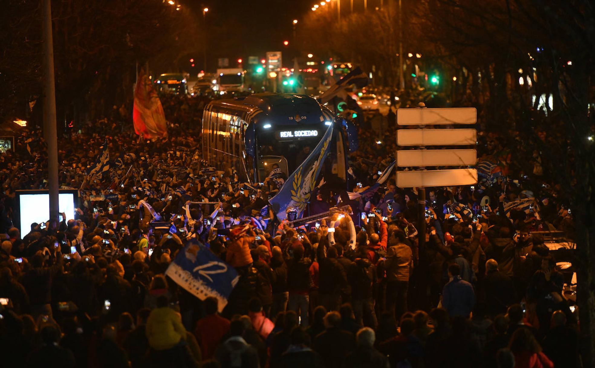 Ambientazo en las inmediaciones del Reale Arena esta tarde para recibir al autobús de la Real Sociedad. Desde minutos antes de las siete de la tarde miles de personas recorrían las calles cercanas al estadio llenándolo todo de los colores txuri-urdin. Gritos de 'Real, Real' y los cánticos habituales en Anoeta han amenizado una espera culminada por la llegada de los jugadores a una Avenida de Madrid que se ha iluminado de rojo por decenas de bengalas.
