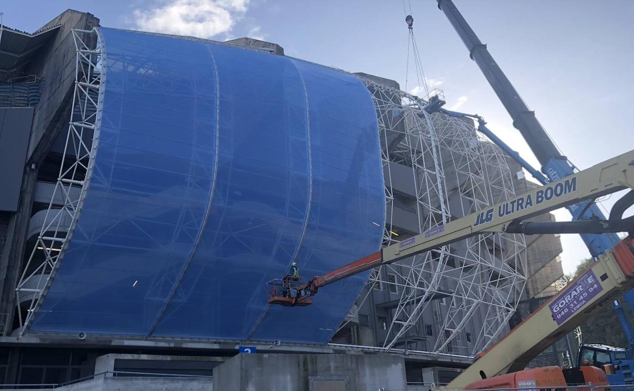 Los operarios han comenzado la instalación de la cobertura azul en la último sector de fachada que falta por cubrir