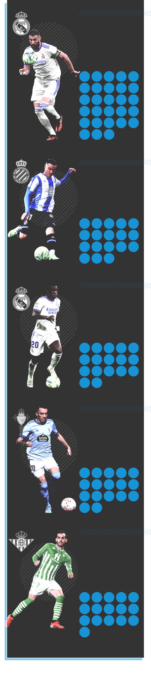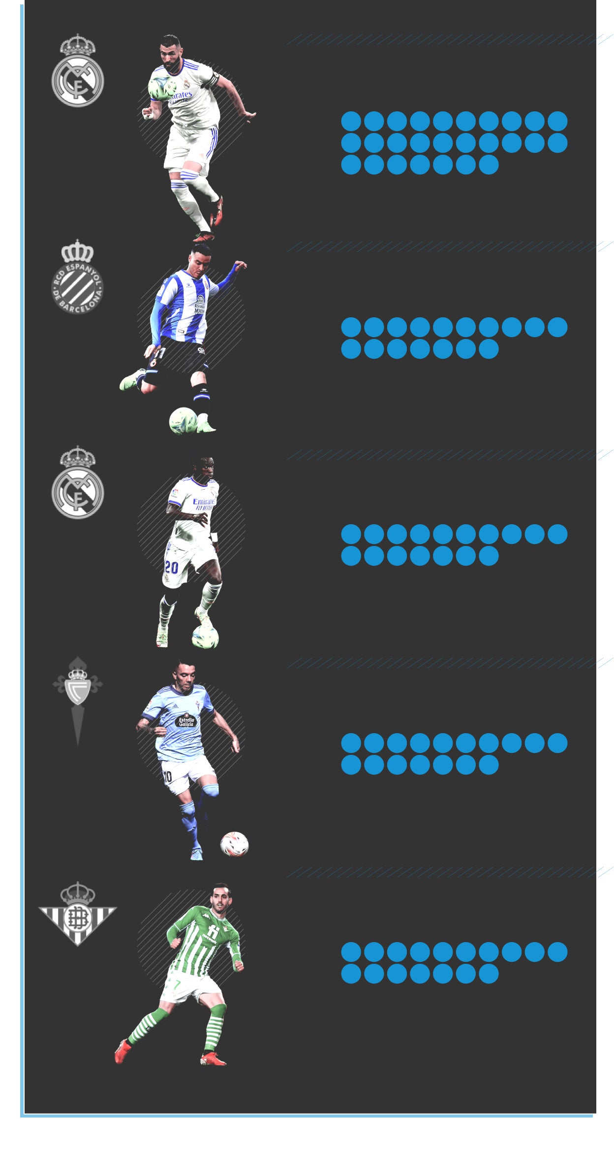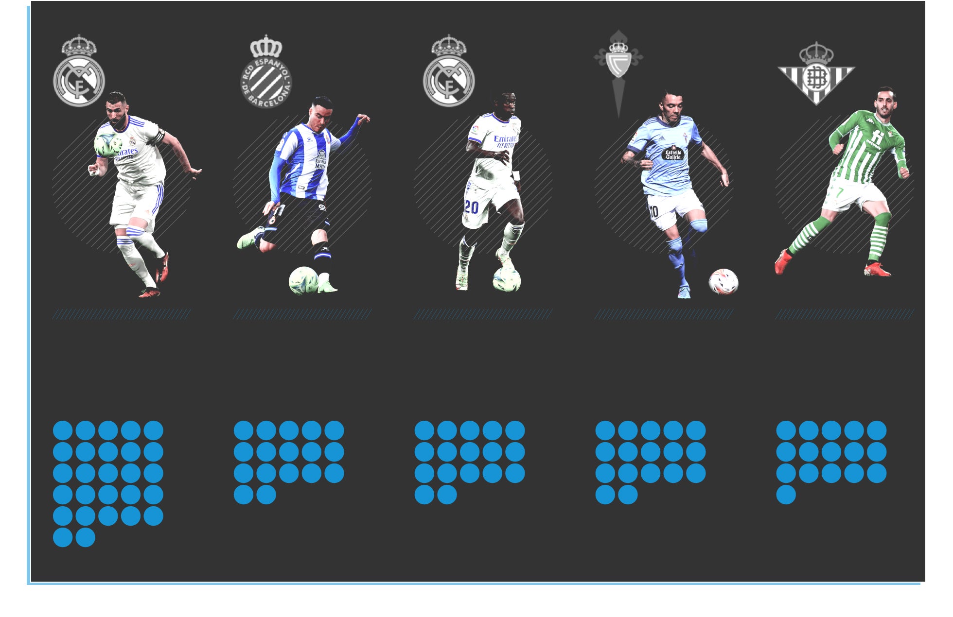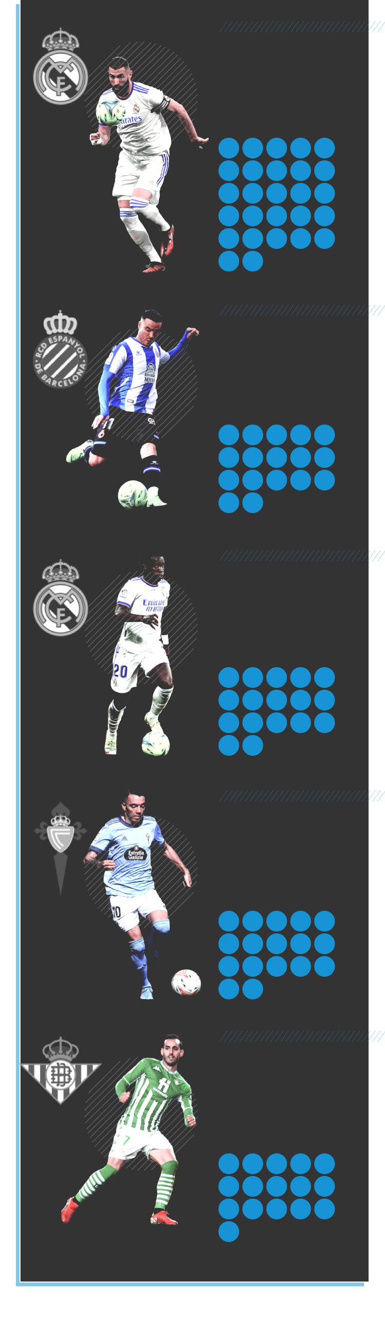 El gol ha sido uno de los aspectos a mejorar a lo largo de la temporada. La Real ha cerrado la temporada con uno de los registros goleadores más bajos en lo que va de siglo: solo 40 goles anotados en 38 jornadas. El gol no ha tenido un nombre propio esta temporada y se ha repartido entre 14 jugadores de la plantilla. Aun así, cabe destacar un año más el acierto del '10' blanquiazul mientras ha estado sobre el campo. Oyarzabal ha sido el máximo goleador del conjunto este curso con 9 goles en Liga. La lesión ha impedido que el de Eibar se haya podido acercar a los números de los líderes de la competición. Benzema se lleva el Pichichi del año gracias a sus 27 tantos.
