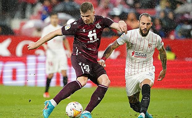 Después el Sevilla, al que le interesaba un encuentro de ritmo bajo, llevó el juego a su terreno. Controló más el balón y dio un paso hacia adelante, no para generar excesivo peligro pero sí para meter a la Real en su campo. De repente le costaba encontrar a Rafinha y a Januzaj y entró en un momento de apagón creativo aunque sin pasar apuros atrás, donde Zubimendi hizo un gran trabajo posicional por delante de Aritz y Le Normand.
