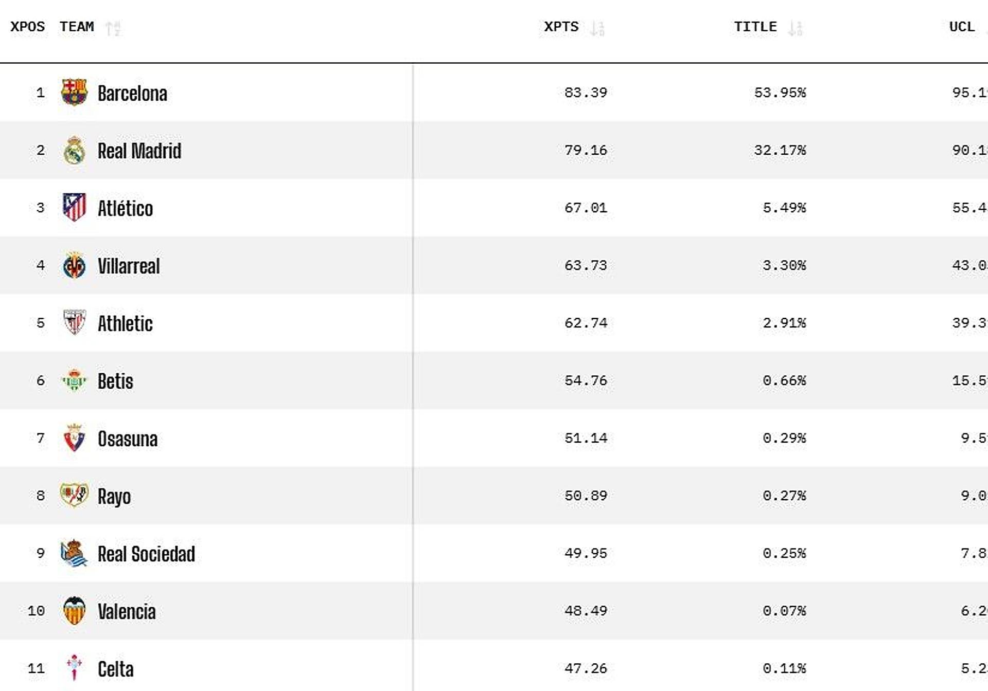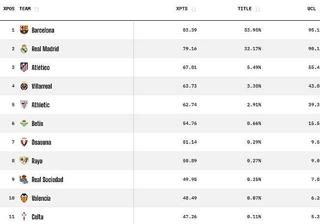 Y aunque se trata de un prestigioso modelo de predicción, que utiliza entre otras herramientas la Inteligencia Artificial, está a años luz de ser infalible. Lo demuestran las previsiones que lanzó en vísperas del primer encuentro de la pasada temporada. Entonces, predijo que el Real Madrid iba a ser campeón de Liga y le otorgó un 86% de opciones de alzar un título que se llevó el Barcelona. También le daba al Girona un 0% de posibilidades de clasificarse por detrás del 15º tras su gran campaña de Champions y terminó 16º, sufriendo para salvar la categoría. También predijo que la Real sería sexta, cinco puestos por encima del real al final de la campaña, que fue el undécimo.