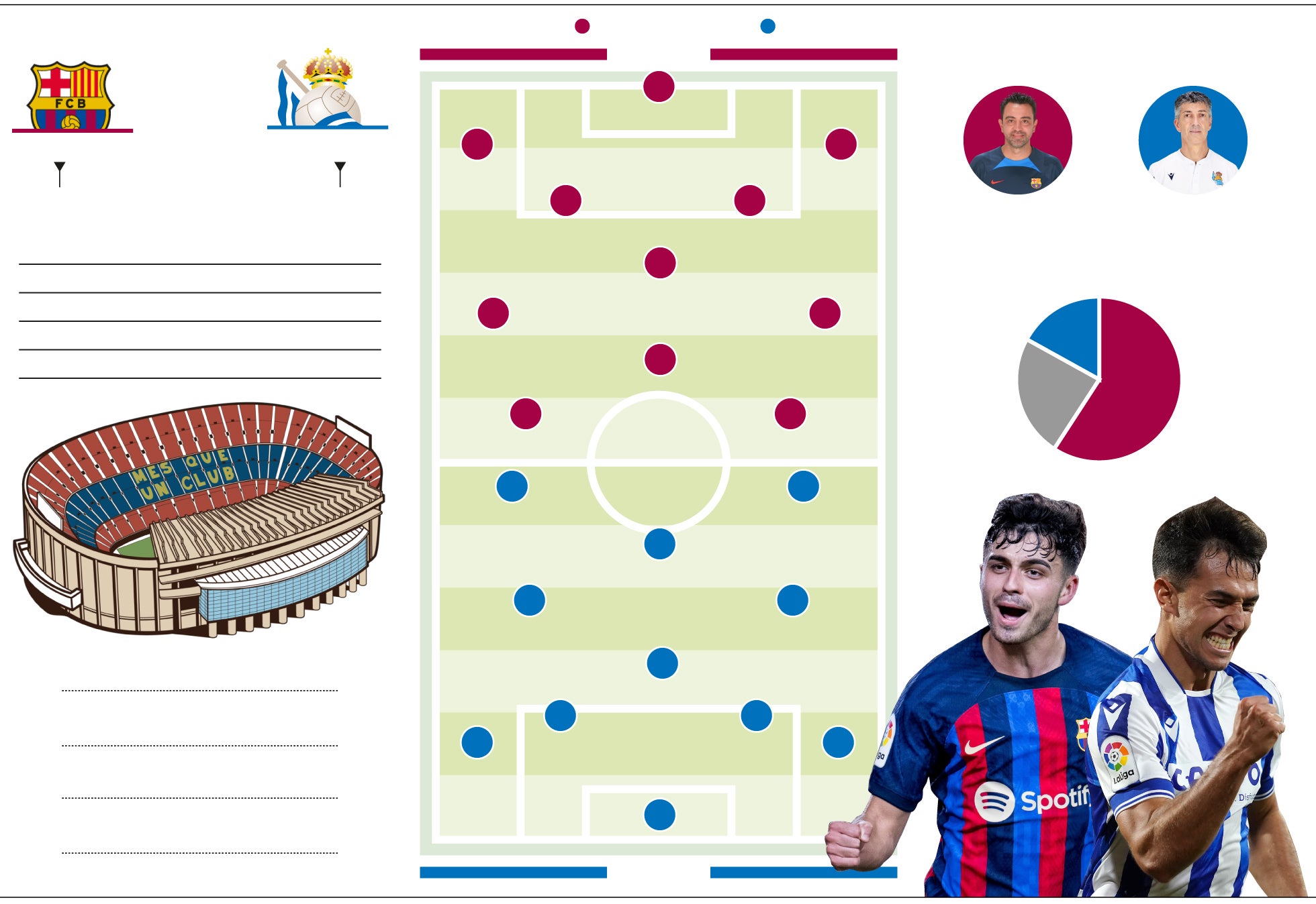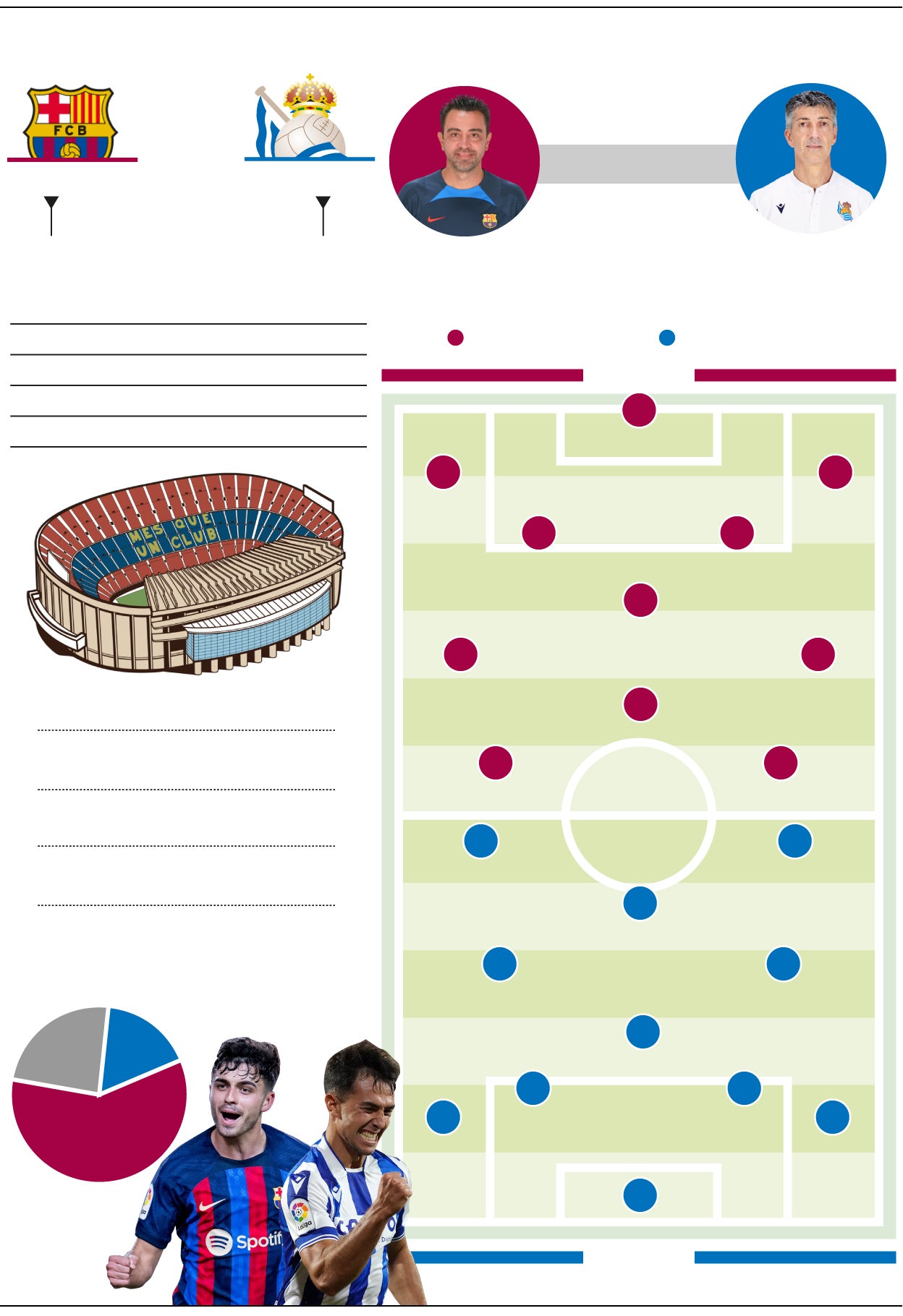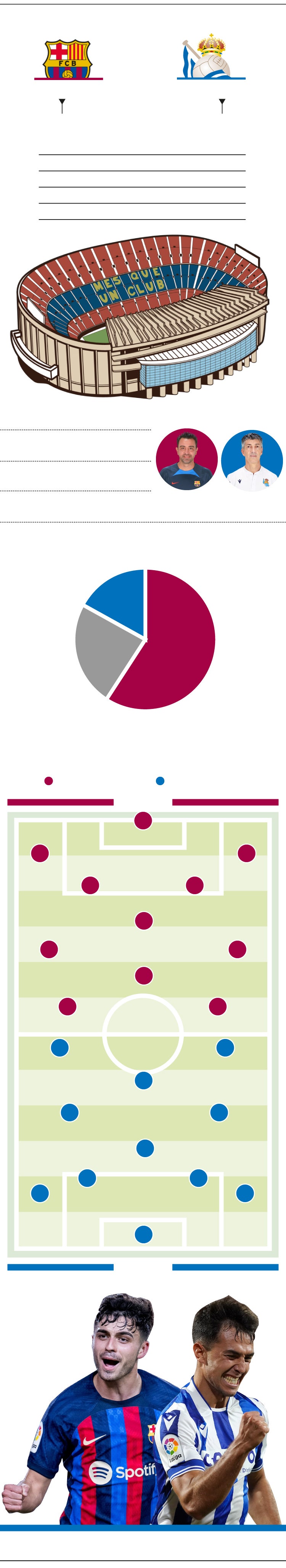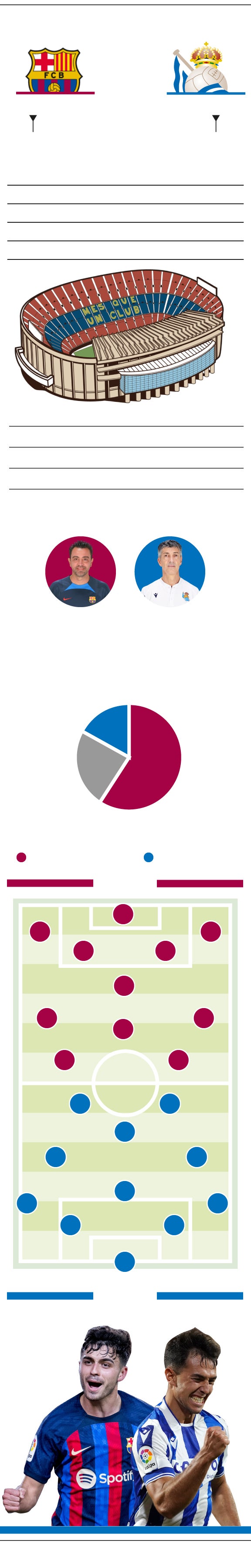 En cualquier caso, el partido se puede decidir en la zona ancha. En el Barcelona, Busquets ejerce de ancla, de protector de los centrocampistas ofensivos. Si está bien, es un muro infranqueable, antes de toparte con los Koundé, Araujo o Christensen. La música la ponen los dos jovencísimos jugadores del Barça y de la selección: Pedri y Gavi. Talentoso y exquisito uno, duro y eficaz el otro. Antes de que De Jong haga sinfonía con el balón, aunque Xavi puede decantarse por un 4-3-3 más ofensivo y dejar a alguno fuera. El neerlandés tiene la mala costumbre de hacer buenos partidos contra la Real, como en la Supercopa de hace tres años, o en el partido liguero del pasado agosto. El destino de la eliminatoria puede ir por quién sale victorioso en la batalla en el centro del campo, aunque otros detalles pueden inclinar el partido a uno u otro lado. Hay que tener en cuenta, además, el escenario. Por eso William Wallace derrotó al ejército inglés en la batalla del puente de Stirling. Los escoceses no hubieran tenido ninguna posibilidad a campo abierto, sí en un paso estrecho, como el escenario de aquel enfrentamiento del siglo XIII. Y es que el Camp Nou es gigantesco. El cuentakilómetros de los centrocampistas de la Real se deberá poner a cero porque habrá que correr mucho.