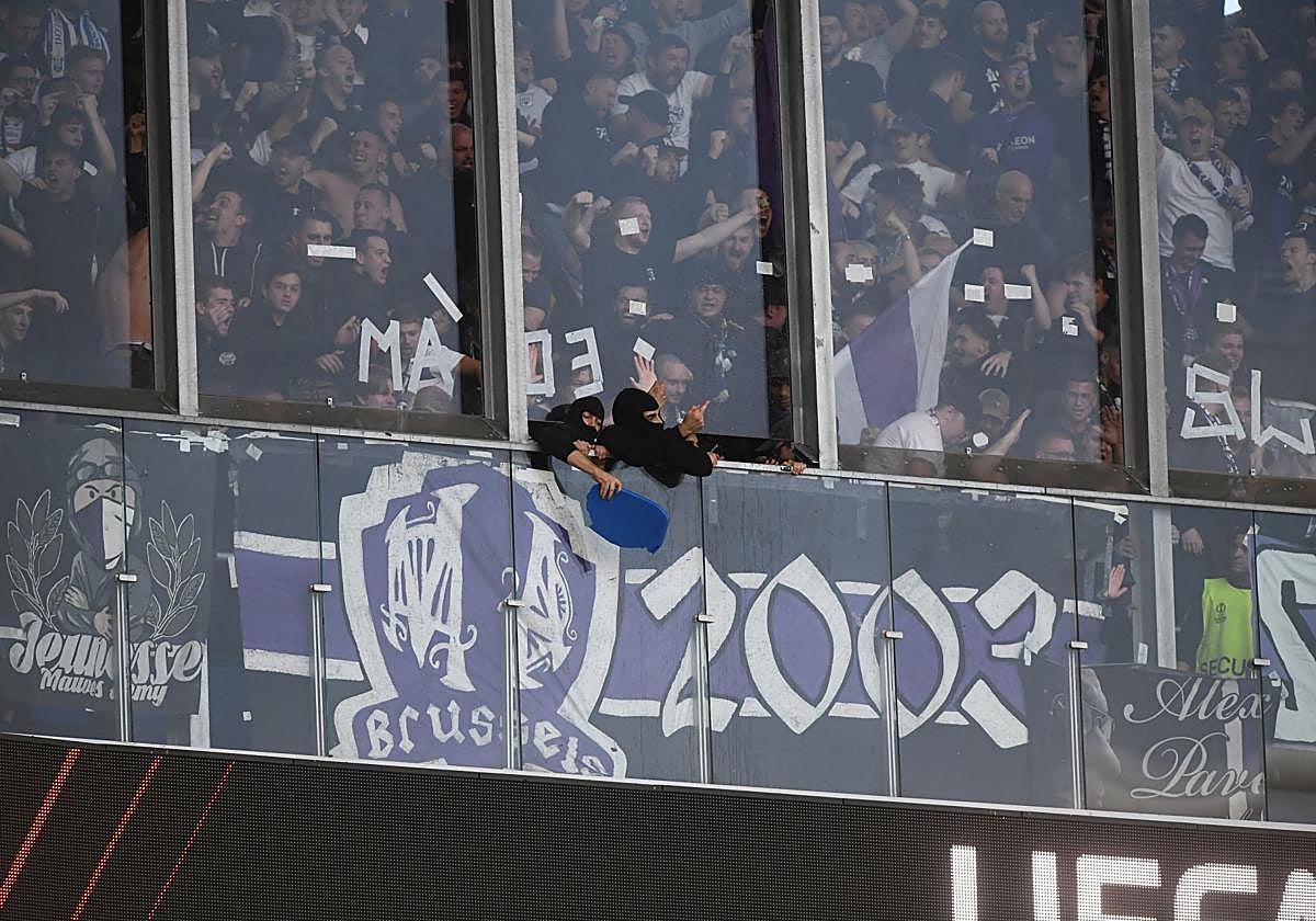 Tras una mañana de tensa calma con los hinchas del Anderlecht, que fueron custodiados en todo momento por la policía local y desfilaron por la ciudad hasta Anoeta sin llegar a producirse grandes incidencias, una vez dentro del estadio rompieron el cristal de protección que instaló la Real Sociedad la temporada pasada y lanzaron objetos a los aficionados txuri-urdin que se encontraban en la grada familiar.